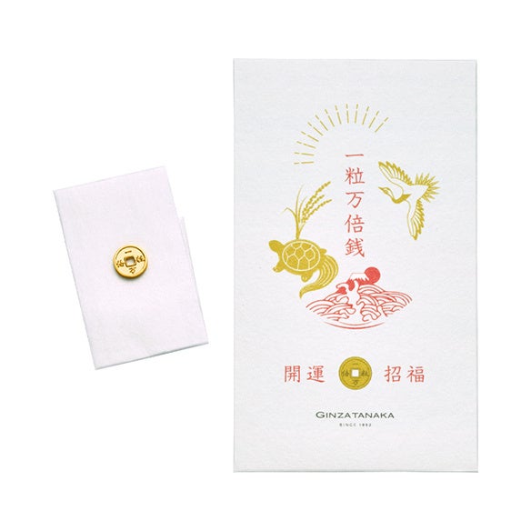 一粒万倍という文字を銭貨(せんか)を模したデザインに入れた、開運を願うアイテムです。一粒万倍とは「一粒の籾(もみ)が万倍にも増えて立派な稲穂になる」という意から、この日に何か新しいことを始めたら大きな結果になって返ってくる例えとして使われています。「純金 一粒万倍銭」を持つ方により一層の福がもたらされるようにとの願いを込めています。