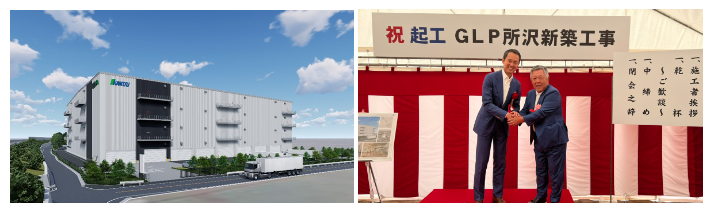 (左)関東新物流センター(仮称)外観完成イメージ / (右)「GLP所沢」起工式の様子