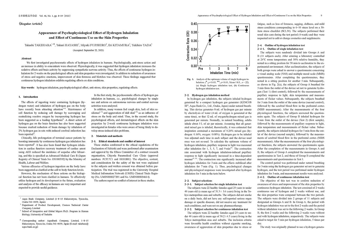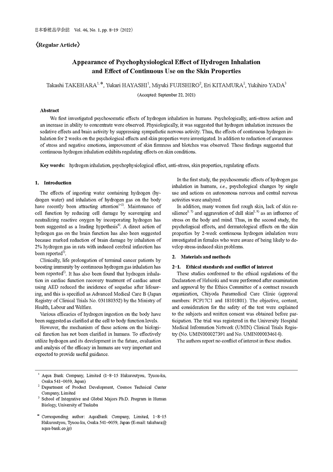 タイトル:Appearance of Psychophysiological Effect of Hydrogen Inhalation and Effect of Continuous Use on the Skin Properties(訳題:水素吸入の精神生理学的効果の出現および連用による皮膚性状への影響)
