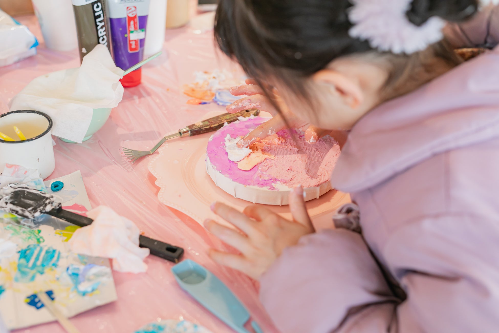 廃材で作ったフレームに漆喰を塗って手形アートのワークショップ |