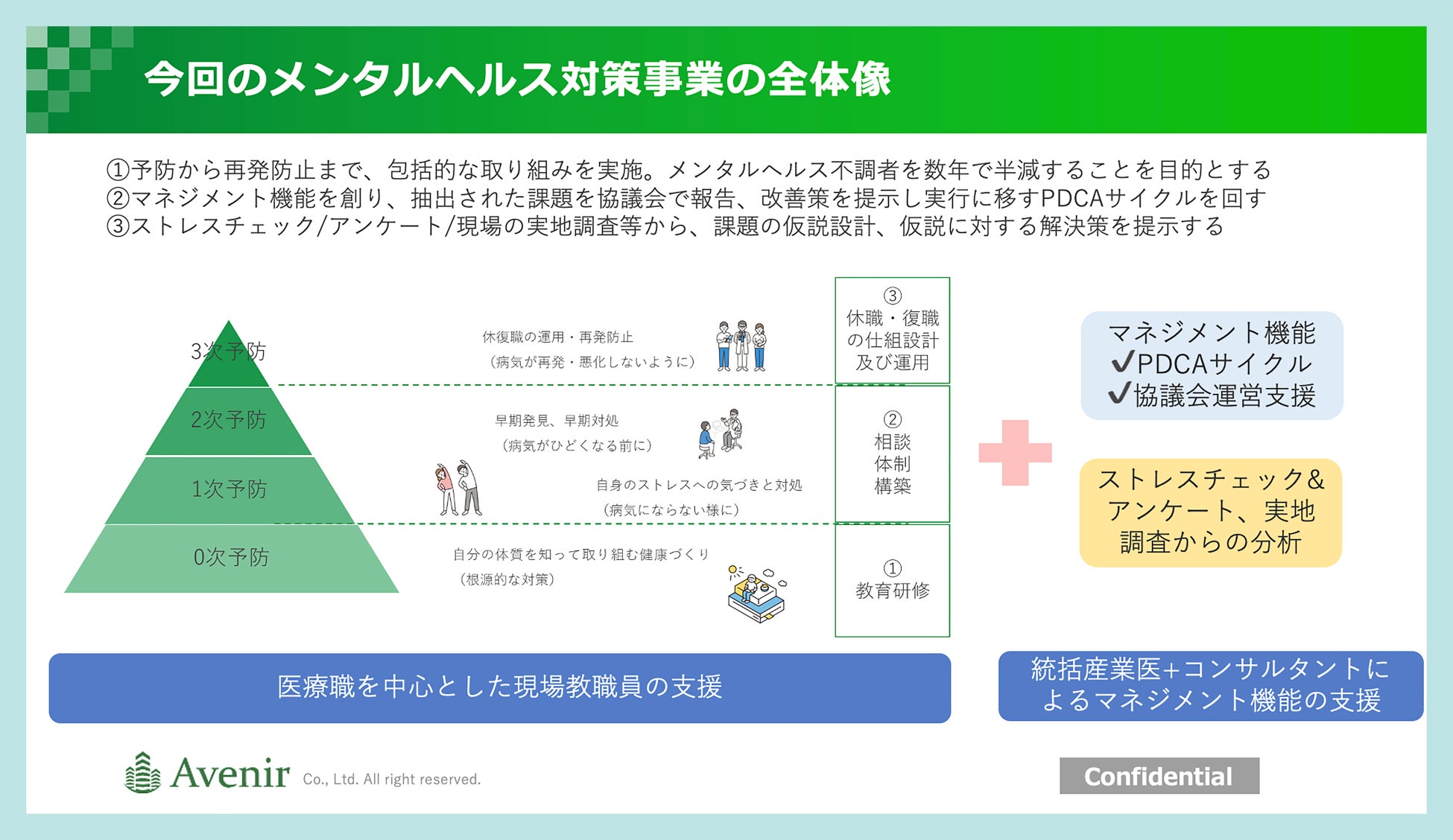 本取組みは、昨今の那覇市の教職員の休職者率が2.13%と全国と比べても極めて休職率が高い状況(全国平均0.64%)であり、機能するメンタルヘルス対策の構築が急務であることなどを受け、『教職員のメンタルヘルス不調の未然防止及び休職者の復職支援の取り組みを強化することにより、休職者、再休職者の減少を目指す』というコンセプトのもと、メンタルヘルステクノロジーズ/Avenirの提供する産業医及び保健師等による役務提供サービス及び労働者の心身の健康管理に関する各種クラウドサービス「産業医クラウド」( https://www.avenir-executive.co.jp/sangyoui/ )などを通じて解決をめざすべく、下記プログラムの構築及び運用を目的としています。