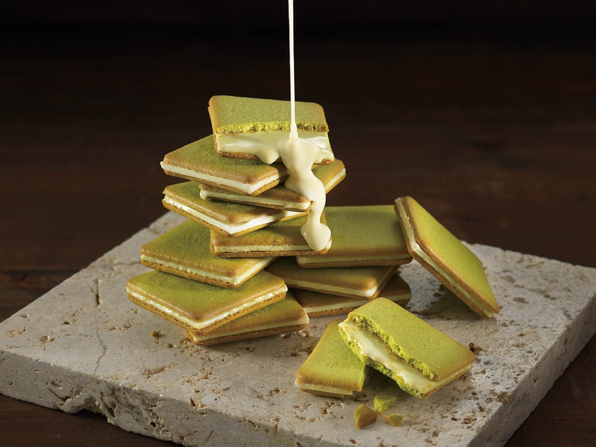 宇治抹茶とイタリア産ホワイトチョコレートを練り込んだガレット生地の中に宇治抹茶クリームを入れ焼き上げ、ホワイトチョコでコーティングしました。