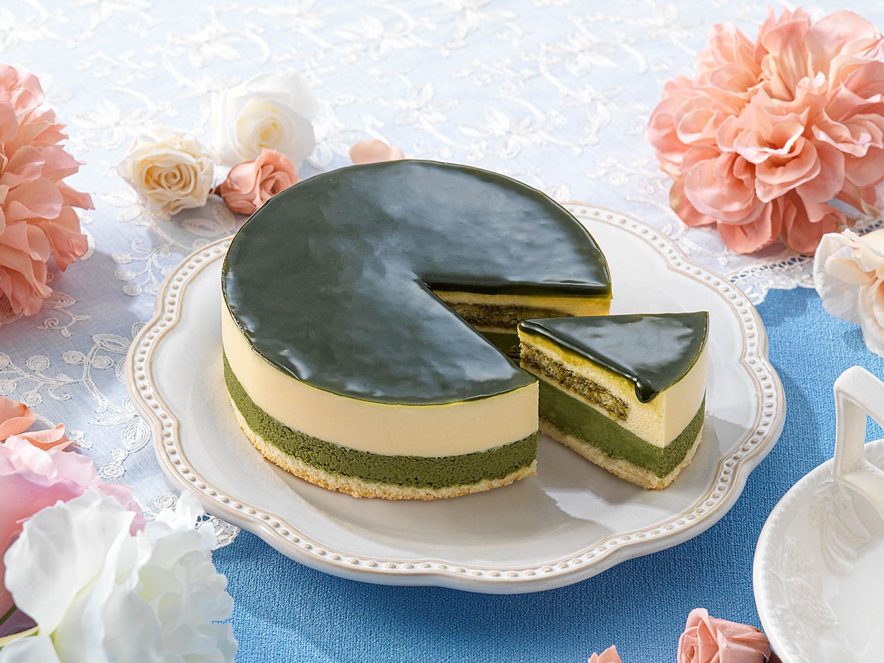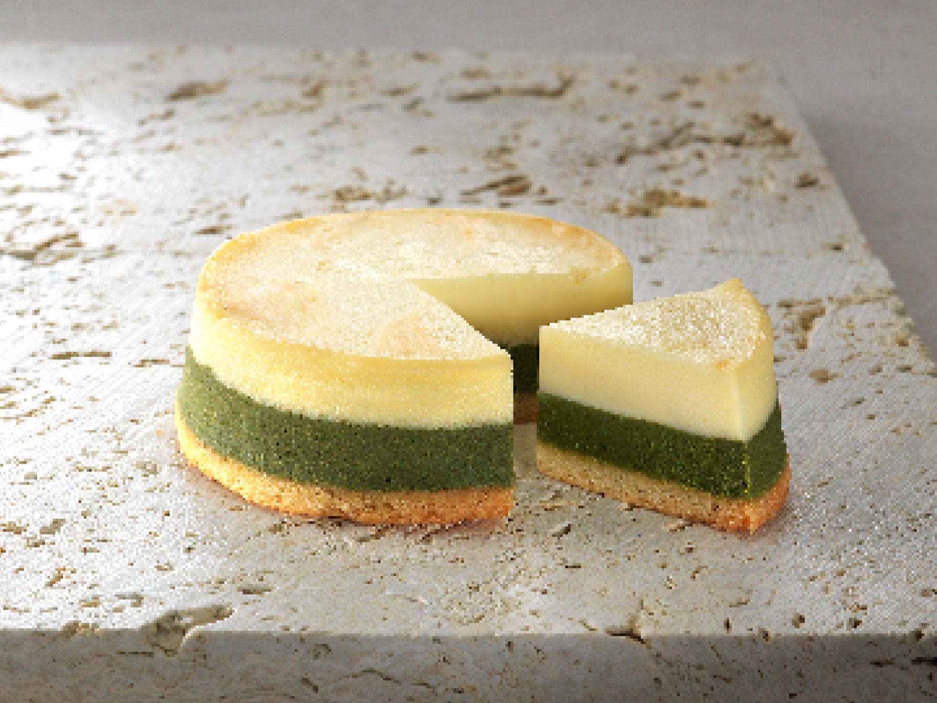 ベイクドチーズとチーズムースの表面に抹茶のナパージュをかけ、濃い抹茶の苦みを感じるチーズケーキです。