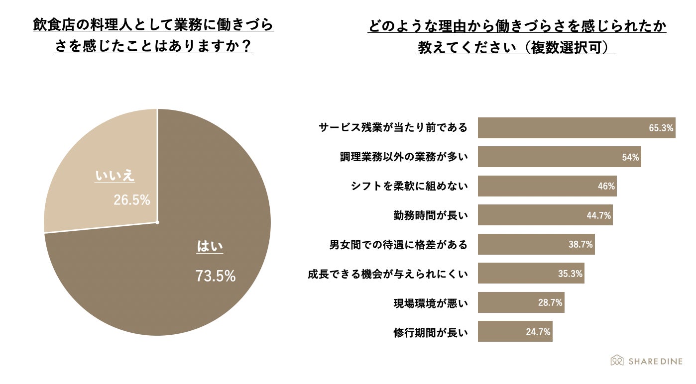 料理人として飲食店での業務に働きづらさを感じたことはありますか、との質問に73.5%が「はい」と答えました。残業や勤務時間が長いことが働きづらさの原因として上位に選ばれています。