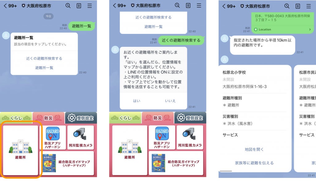 今回のリニューアルでは「避難所検索機能」を導入しています。自分の位置をLINEに送信すると、近くの避難所施設を案内することができる機能です。普段から近くの避難所を確認しておくことが可能になっており、災害が発生した際は開設状況なども知ることが可能です。