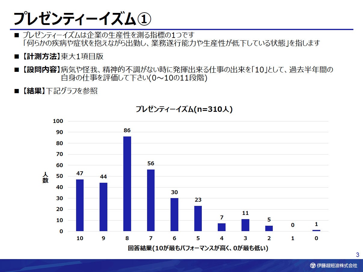 弊社では従業員へのアンケートをもとに、従業員の健康状態を把握、数値化しています。今後もこれらの指標を取り入れながら従業員の健康維持・増進に努めてまいります。