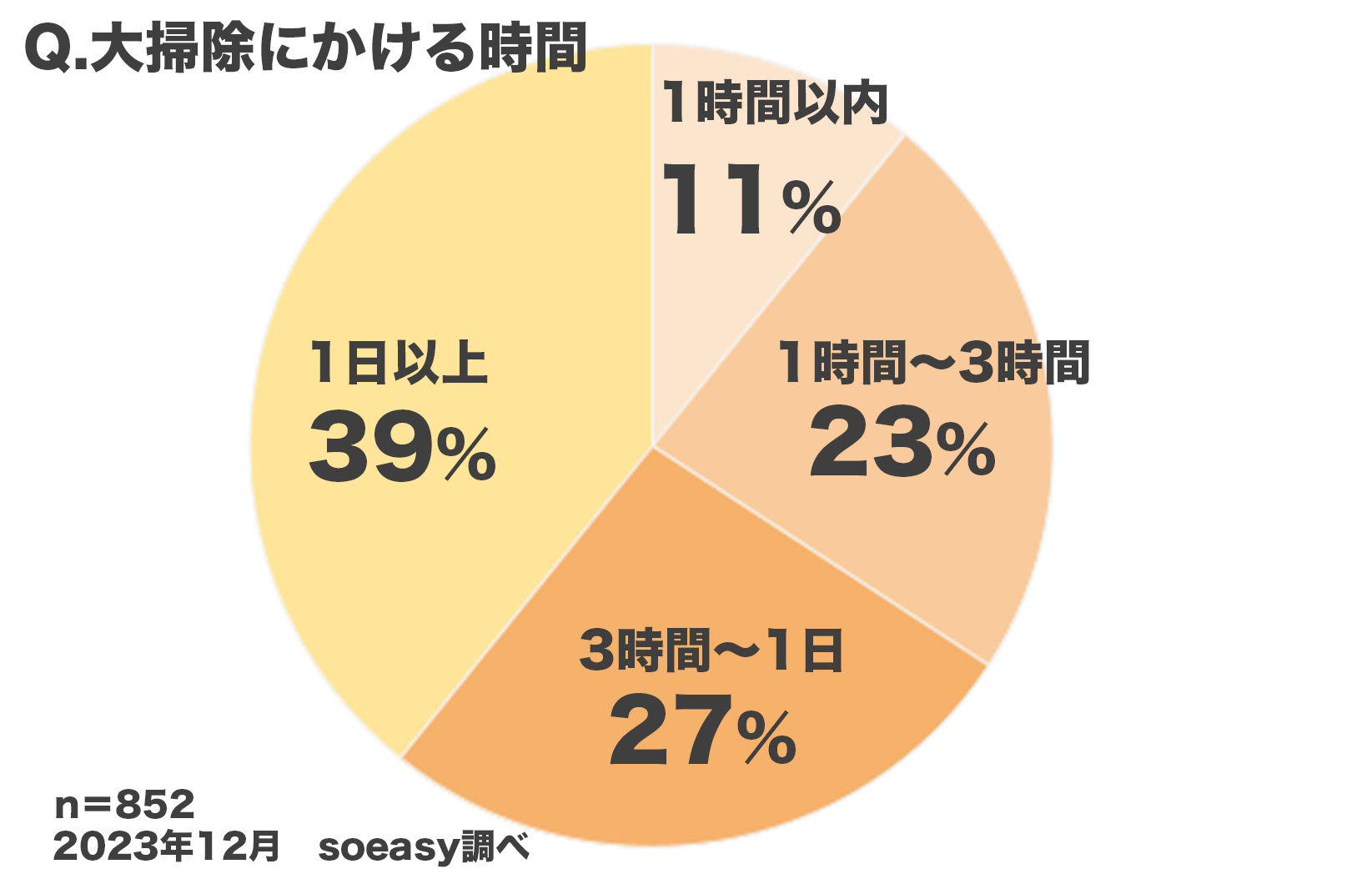 続いて、大掃除にかける時間を聞いたところ「1時間以内」「1時間から3時間」「3時間から1日」合わせて、518(61%)という結果となり、大勢が大掃除日を決めて1日で掃除し切る傾向が伺い知れる結果になりました。