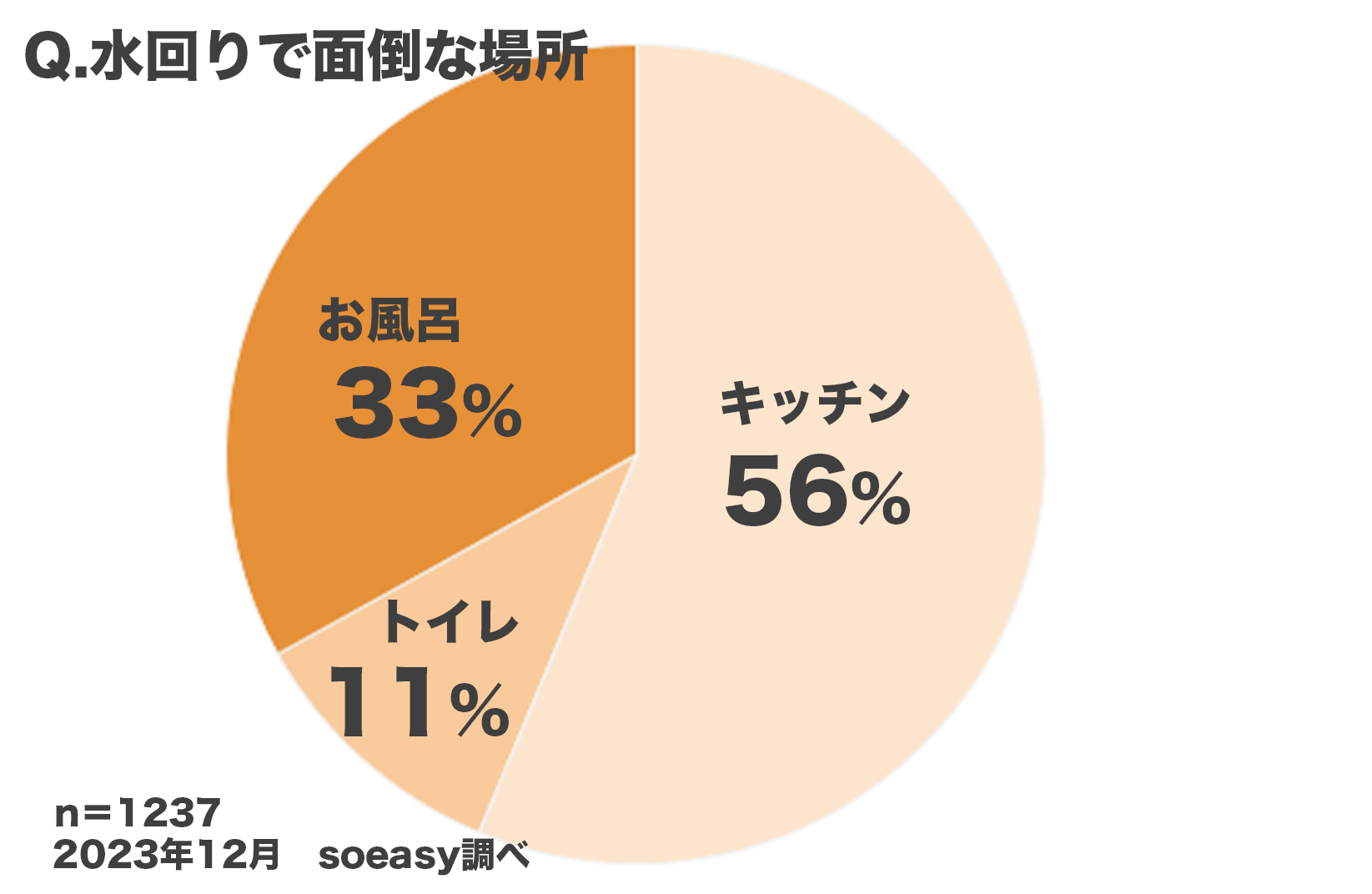 今回の調査で最もn数が多かったこちらの設問では、具体的にどこに大掃除における面倒さを感じているのかにフォーカス。結果は「キッチン」だけで過半数を超える696(56%)が回答し、「お風呂」410(33%)、「トイレ」131(11%)と比較しても、大半の方が面倒さを感じている場所であることが伺い知れました。