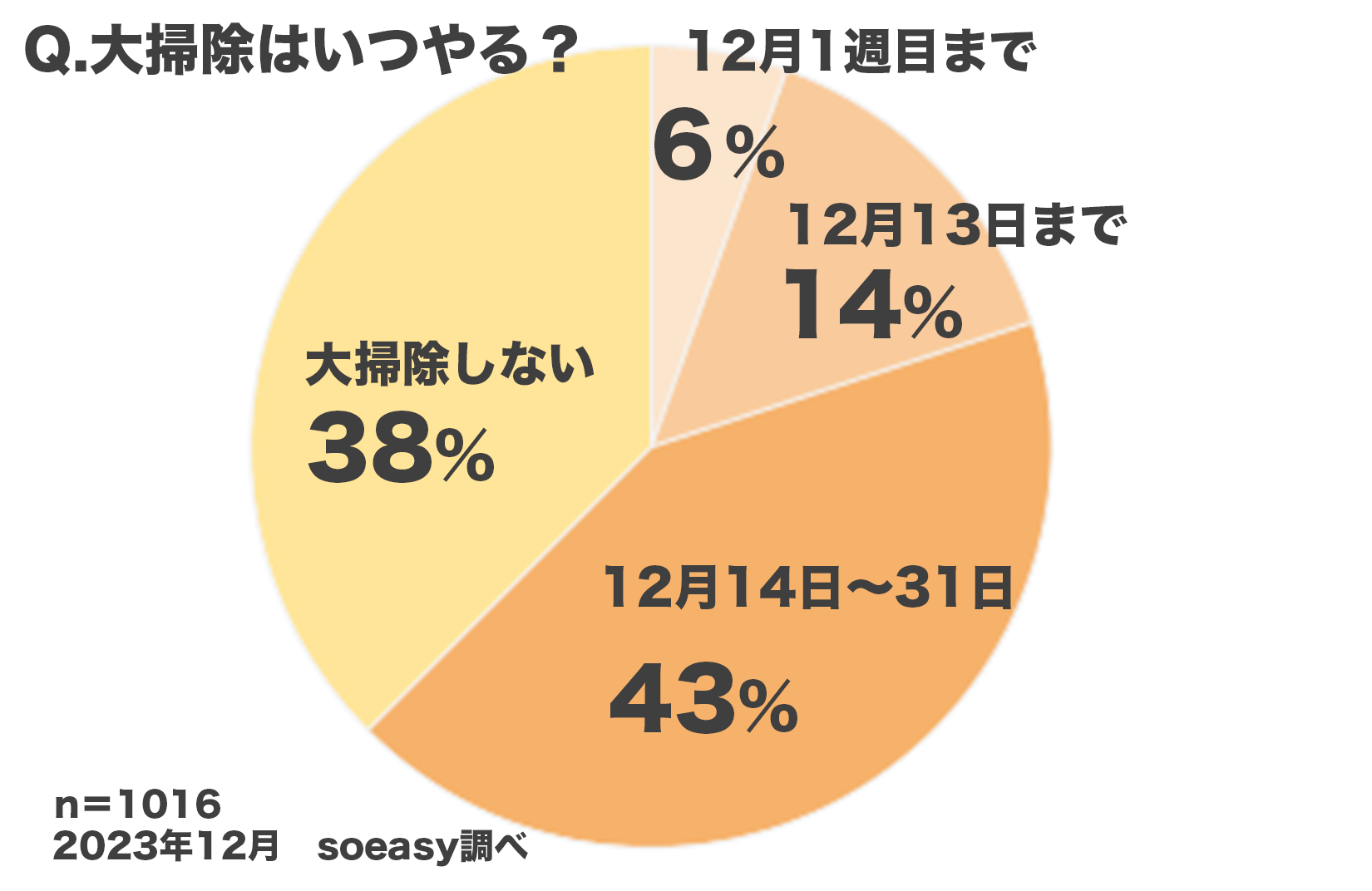 最も多い回答となったのが、この先「12月14日から31日」という回答で、432(43%)の方々に回答いただきました。意外と多かった回答が「大掃除しない」381(38%)という回答。普段からまめに掃除をしているか、特段必要性を感じていないか、気になるところです。