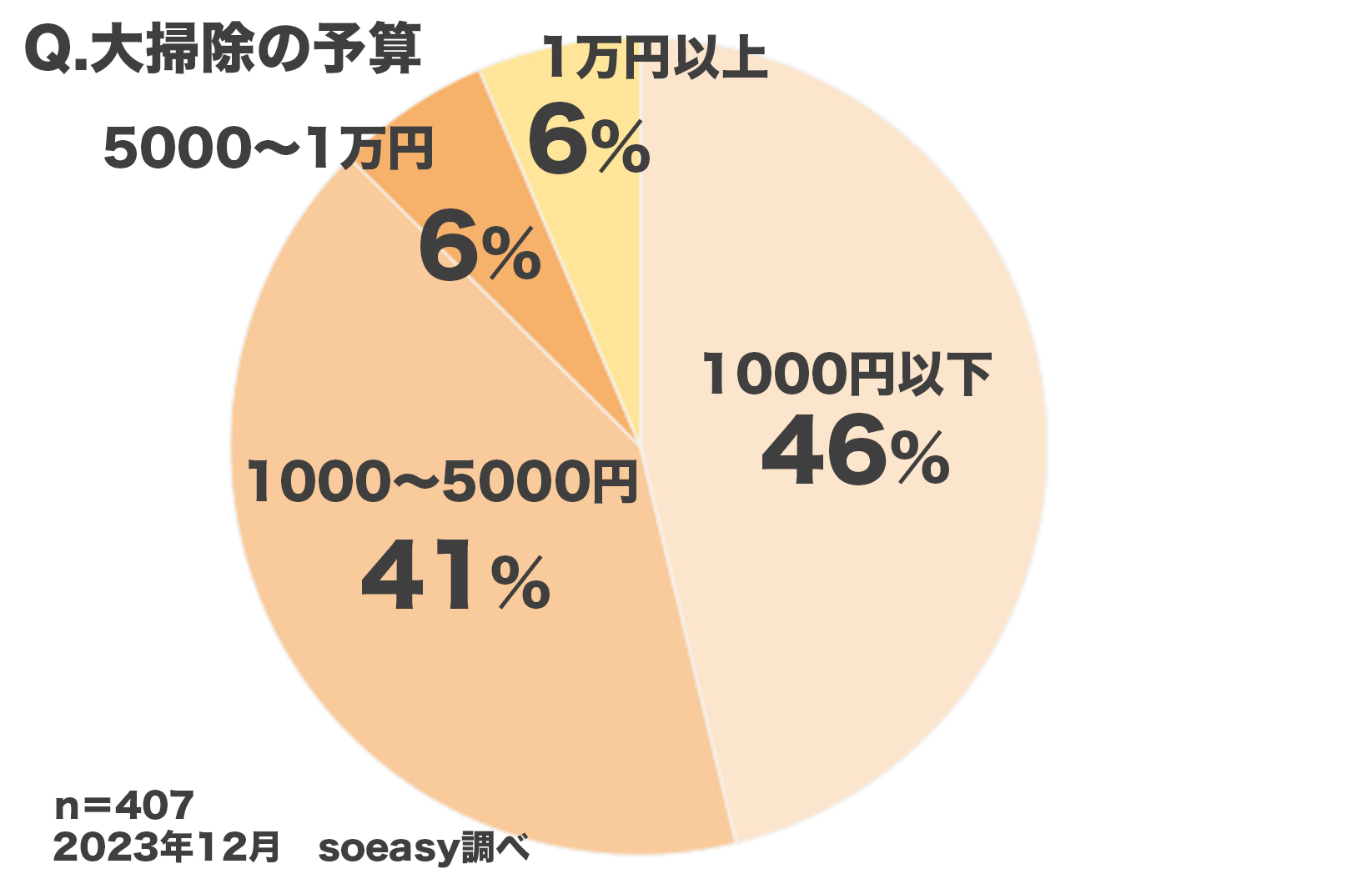 大掃除にかける予算については、「1,000円以下」188(46%)と、「1,000円から5,000円」168(41%)が拮抗する結果に。私たちのライフハック動画でも人気の100円ショップの有効活用ノウハウが浸透されてきたのか、はたまた物価高が続いた年度だけあって、節約傾向が働いたのか、あまり費用をかけない実態が垣間見える結果になりました。