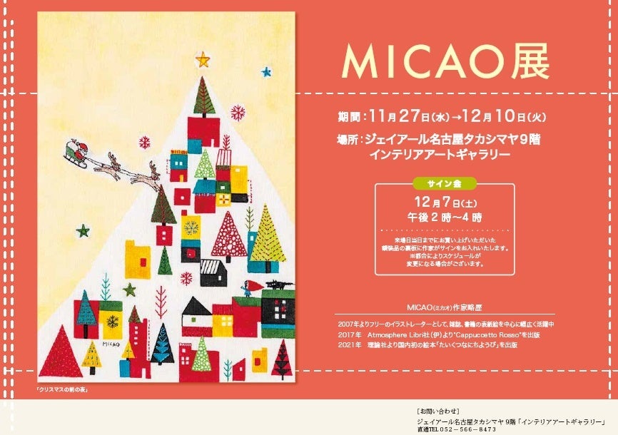 【ジェイアール名古屋高島屋】『MICAO展』 今年最後の作品展。大人気でコレクターも多い刺繍原画大小約40点を展示販売。ジクレー、ポストカードの販売や 作家来場も。2024年11月27日(水)~開催。
