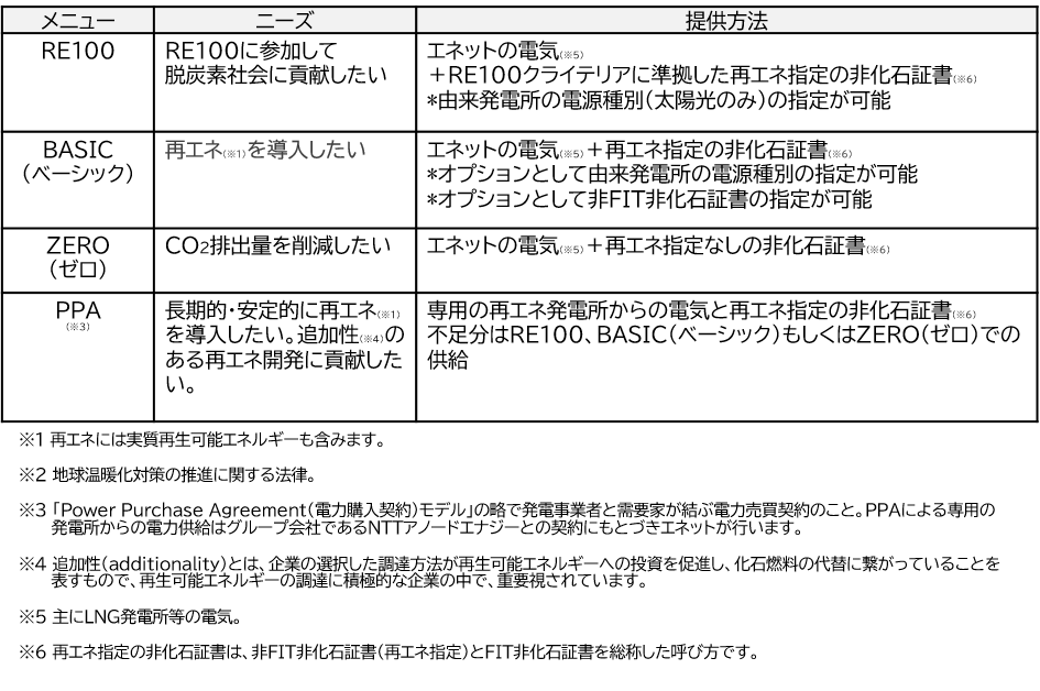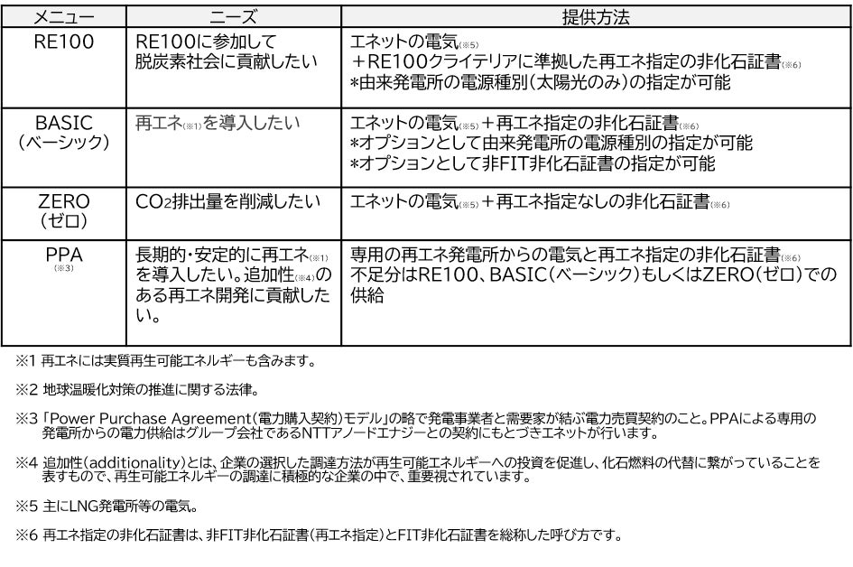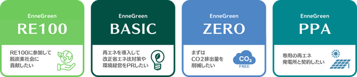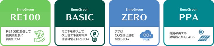 このたびのリニューアルでは、国際的イニシアティブRE100参加要件に対応する「EnneGreen RE100」、再生可能エネルギー(※1)を導入する「EnneGreen BASIC(ベーシック)」、取引先からの要請や温対法(※2)に対応してCO2排出量を削減する「EnneGreen ZERO(ゼロ)」、長期的・安定的に再生可能エネルギーを導入する「EnneGreen PPA(ピーピーエー)」により、多様化するお客さまのニーズに合わせたメニューを提供します。