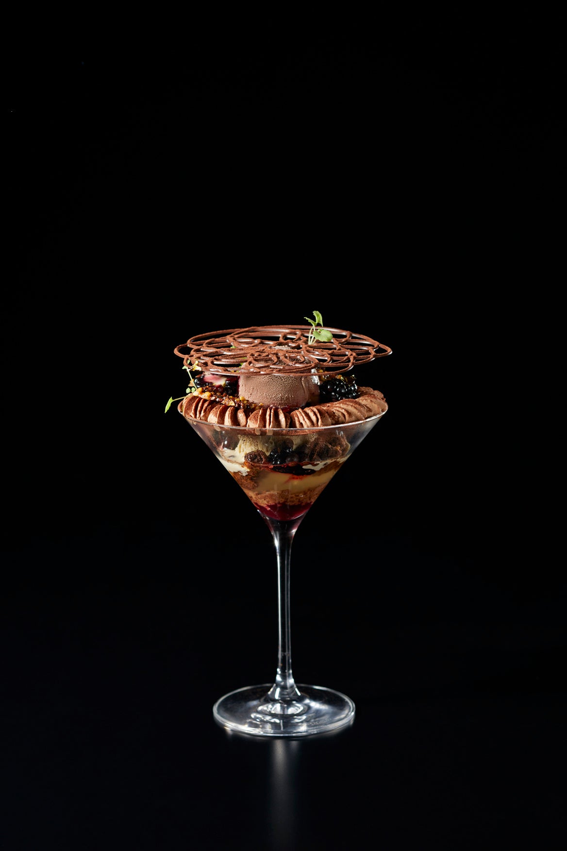カカオ67%のビターチョコレートをふんだんに使用した、チョコレート尽くしのパフェ。