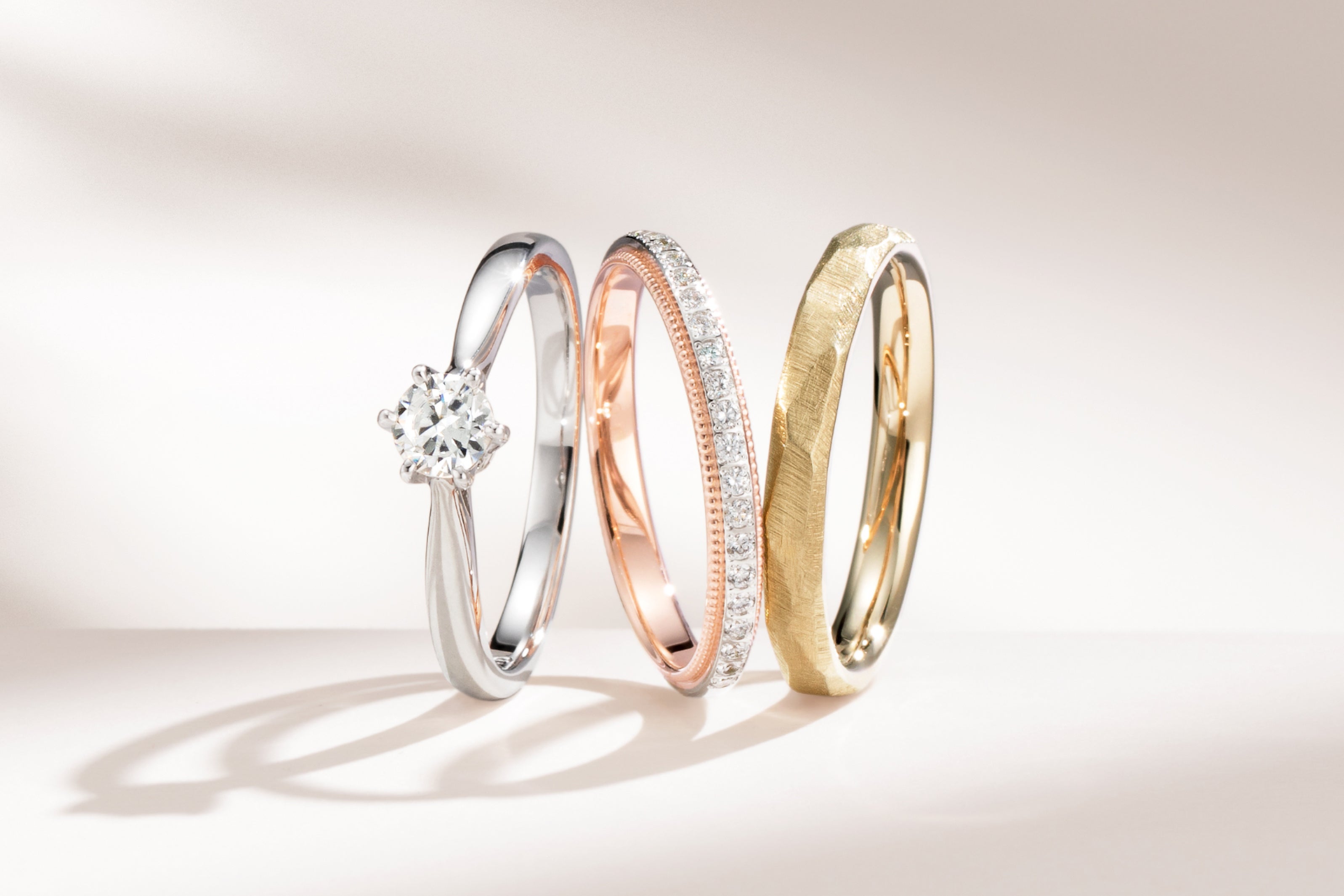 ブリリアンスプラスの結婚指輪は、素材の選択肢が豊富なのも強み。プラチナはもちろん、多彩なゴールド素材の結婚指輪をご用意しております。