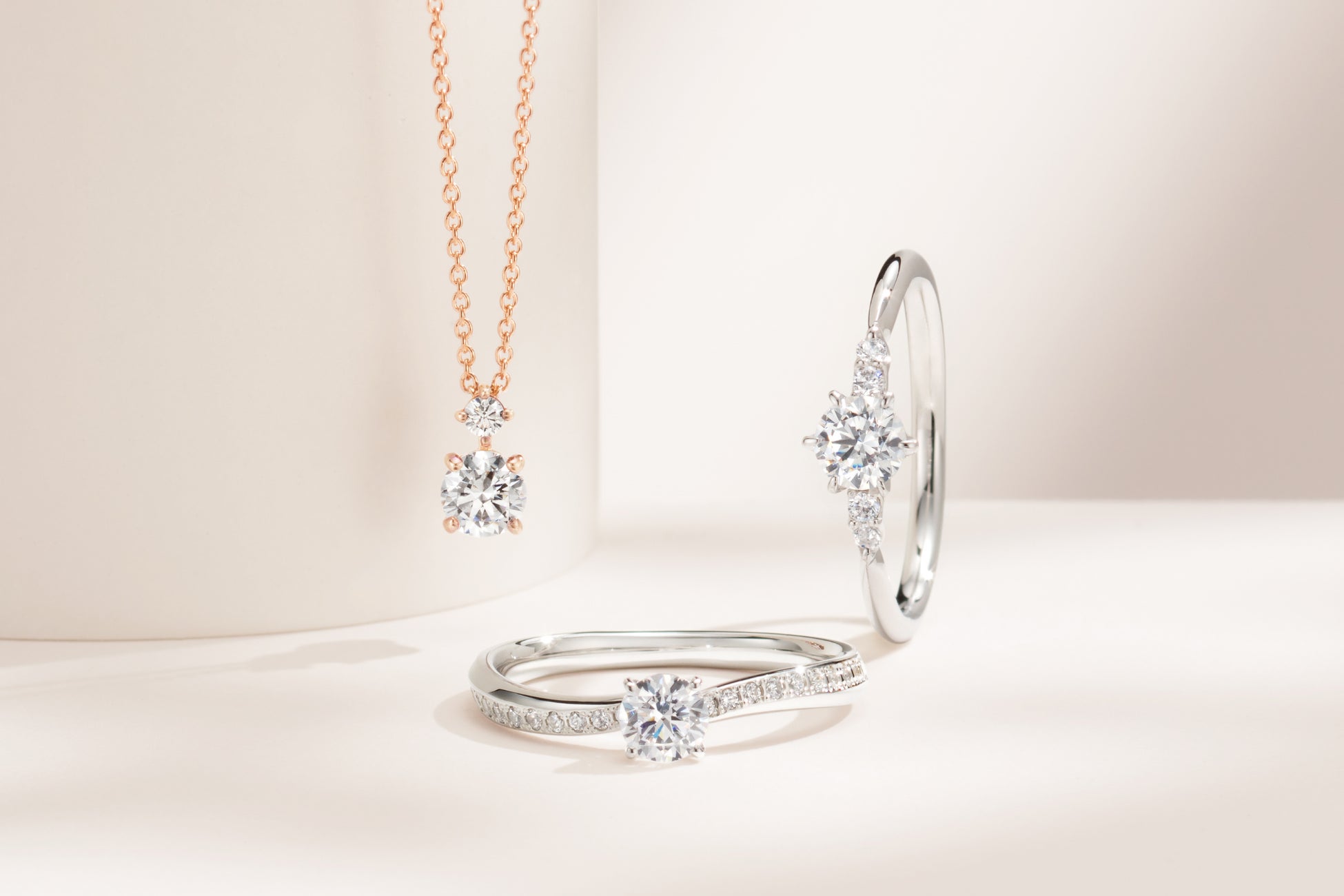 3万個以上の選択肢から選ぶダイヤモンドと多彩なデザインを組み合わせ、理想を形にすることができる「婚約指輪」「婚約ネックレス」。ダイヤモンドを贈り、デザインは後から選ぶ『ダイヤモンドでプロポーズ』。