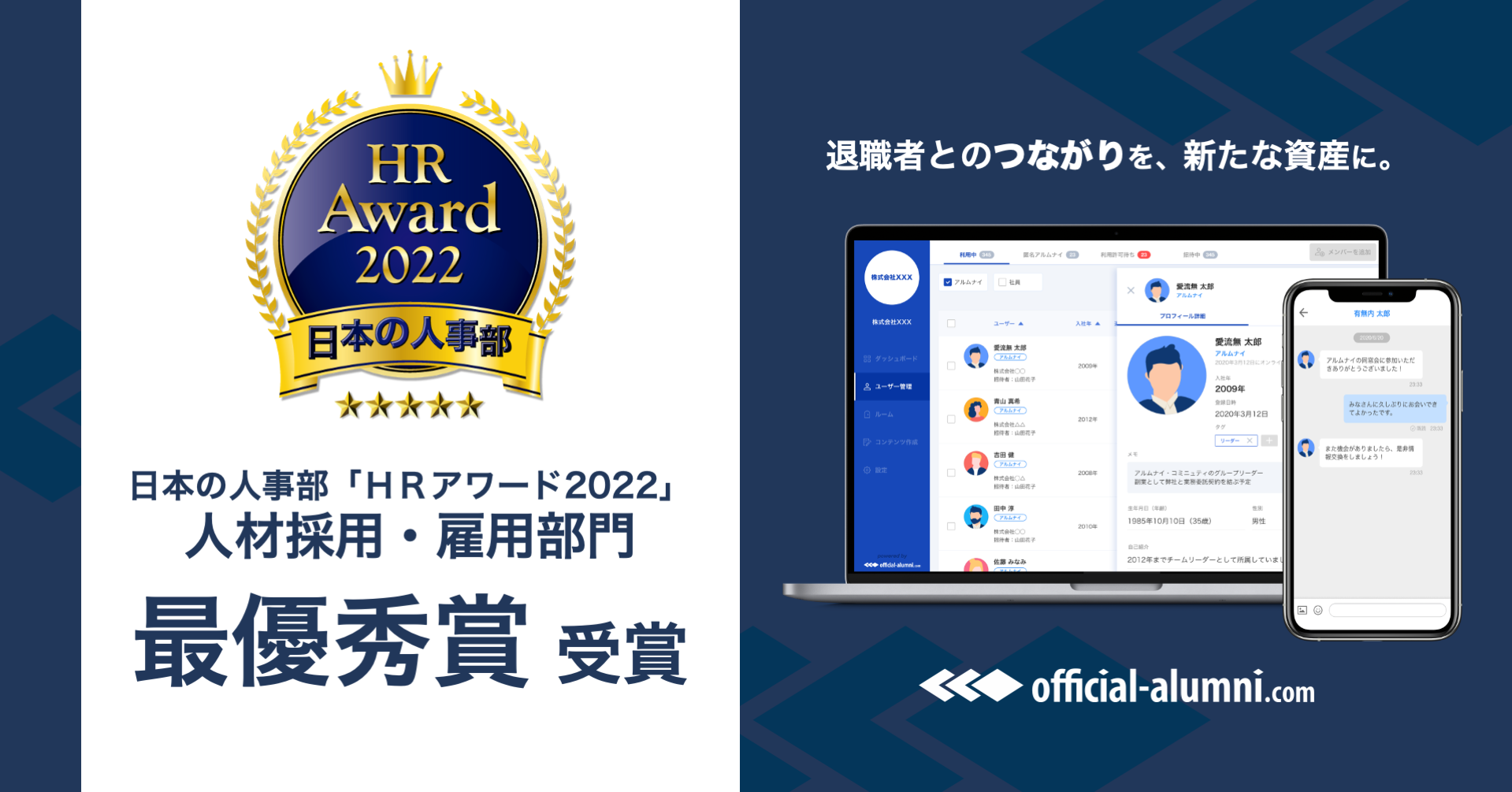 アルムナイ専門サービスシェアNo1の『Official-Alumni.com』が、日本の人事部「HRアワード2022」人材採用・雇用部門最優秀賞を受賞