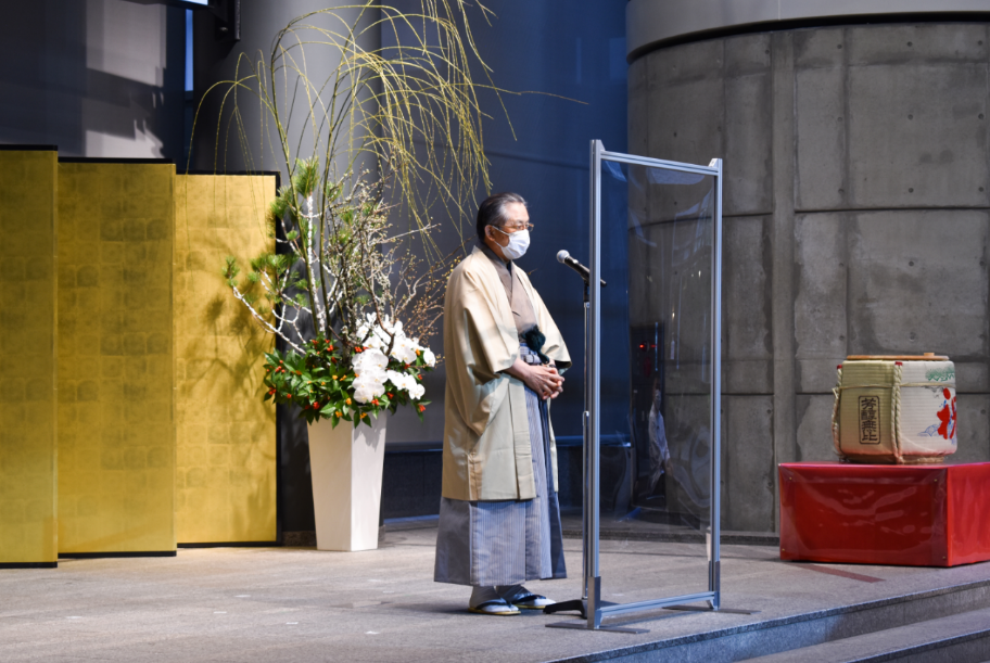 京都リサーチパーク株式会社(代表取締役社長 小川 信也)は、2022年1月11日(火)、京都リサーチパーク(以下、KRP地区)東地区アトリウムにて「KRP地区賀詞交歓会2022」を開催しました。門川大作京都市長にも来場いただき、KRP地区内のご入居企業・産業支援機関や関係機関の皆様と共に新年の門出を祝いました。2年ぶりとなった賀詞交歓会は昨年からの新型コロナウイルス感染状況を鑑み、規模を縮小するほか、エアー鏡開きやエアー乾杯など工夫をこらしました。2020年度以降、KRP地区に入居された企業の皆さまを紹介する場もあり、久しぶりの地区内交流の時間となりました。