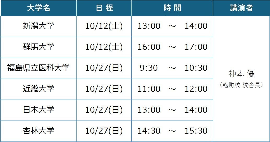 10月の講演は新潟大・群馬大・福島県立医科大学の国公立大3校と日本大・杏林大・近畿大の私立大3校を対象に実施します。講演は、麹町校校舎長の神本優(かみもとまさる)が担当。最新の全統模試結果から見た各大学の志望動向をはじめ、入試対策や最近話題となることの多い地域枠の実態など、さまざまな観点について、河合塾ならではの情報量と豊富な指導経験からお伝えします。