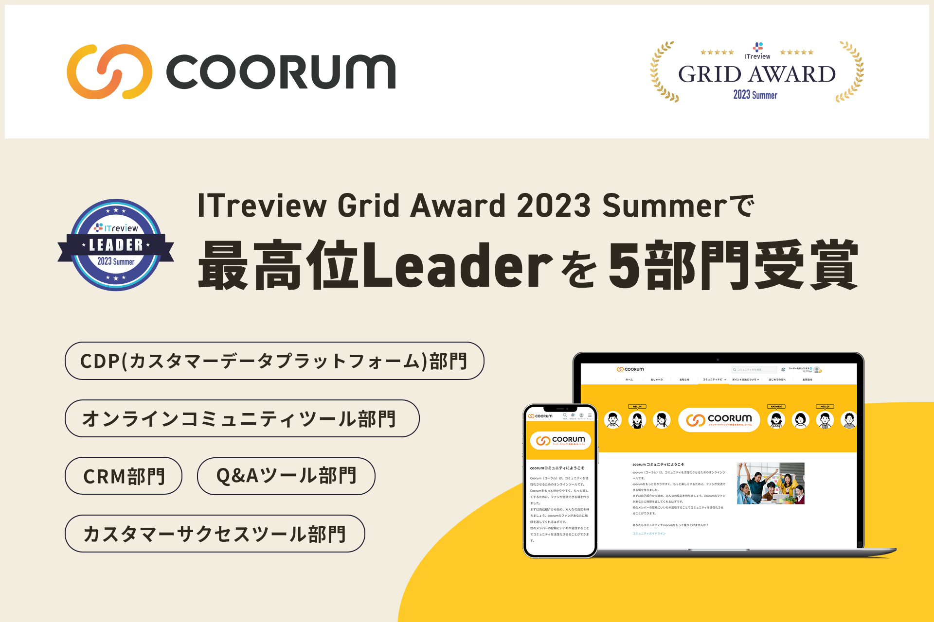 ロイヤル顧客プラットフォーム「coorum」が、「ITreview Grid Award 2023 Summer」の5部門で最高位「Leader」を受賞