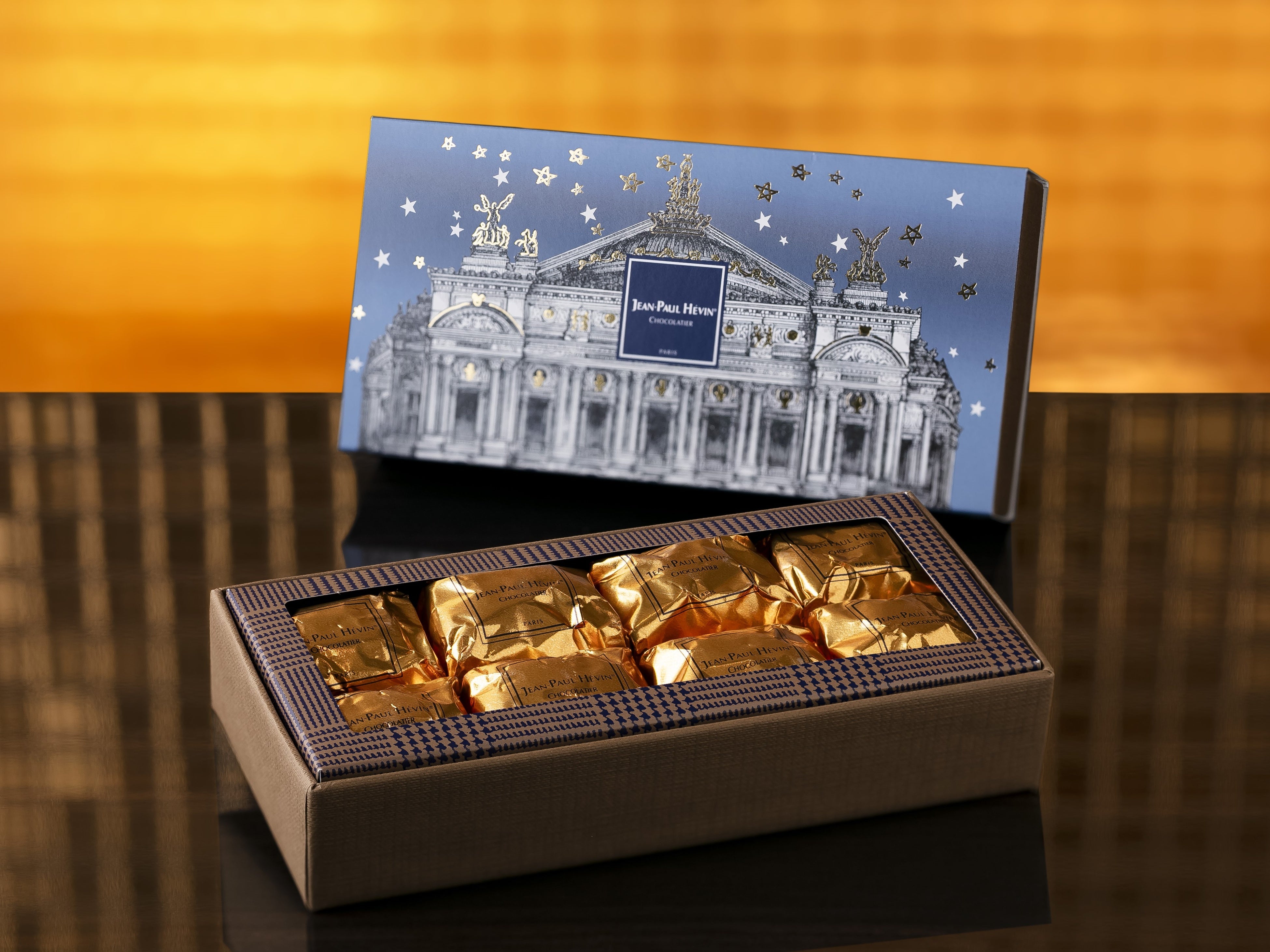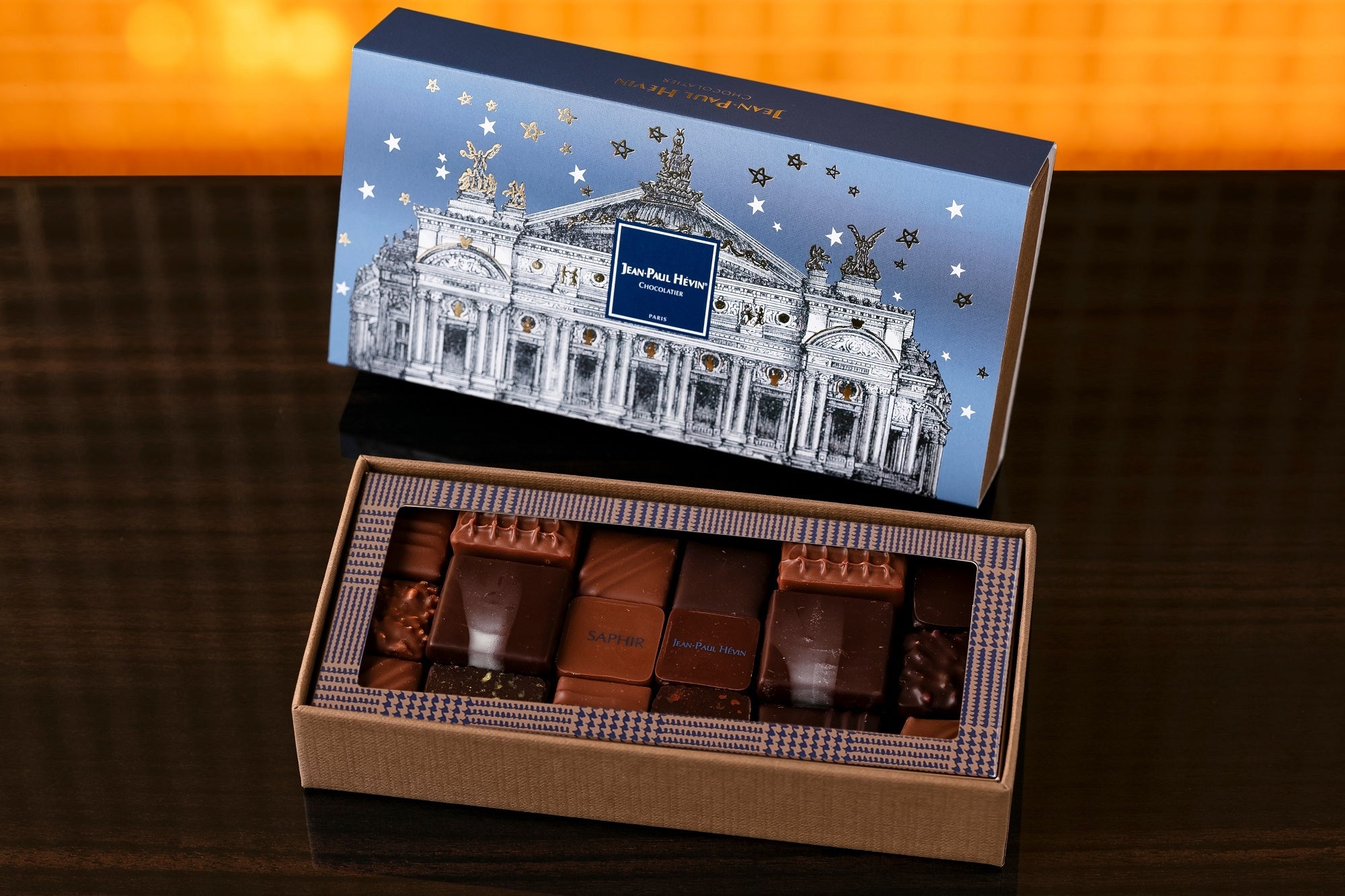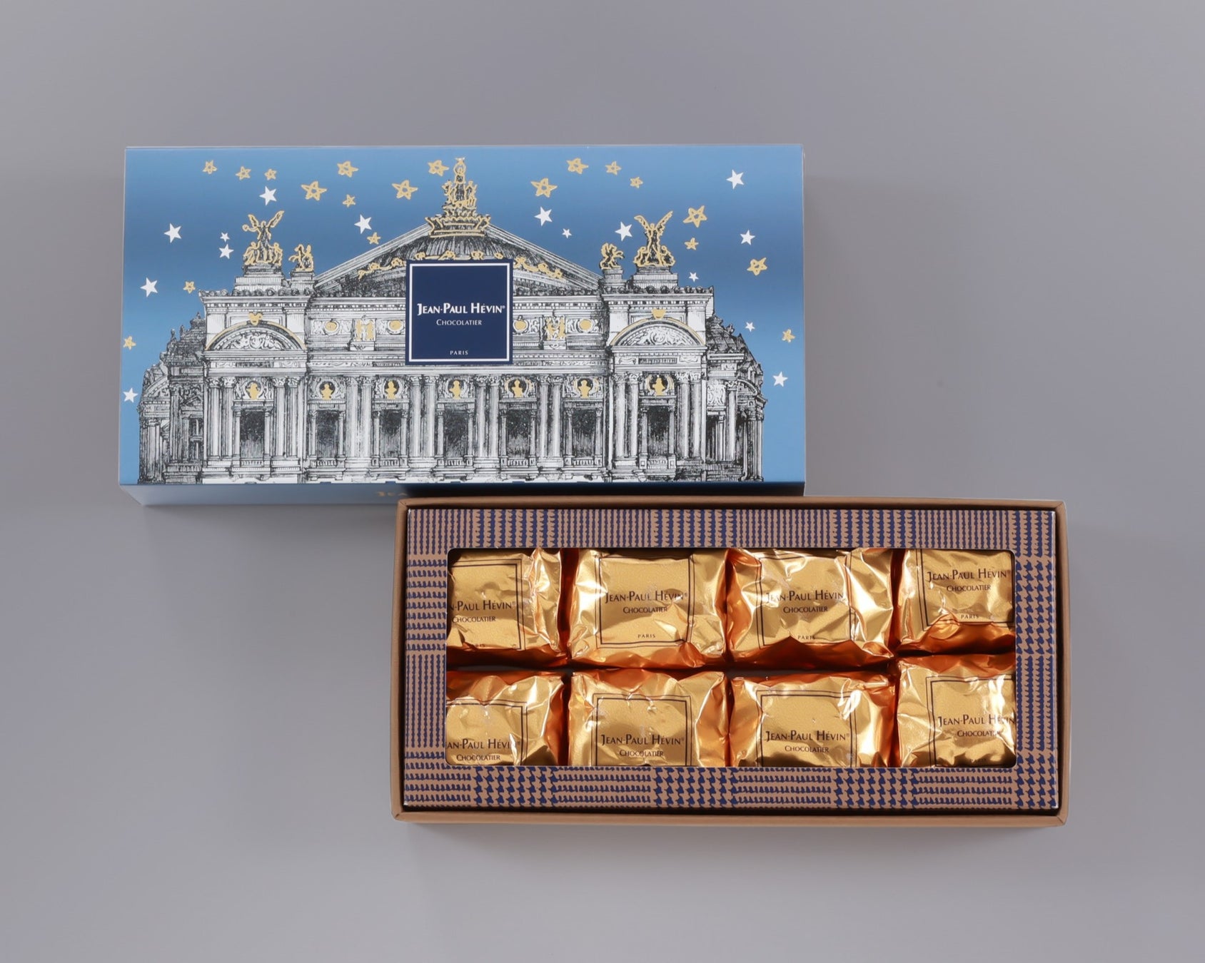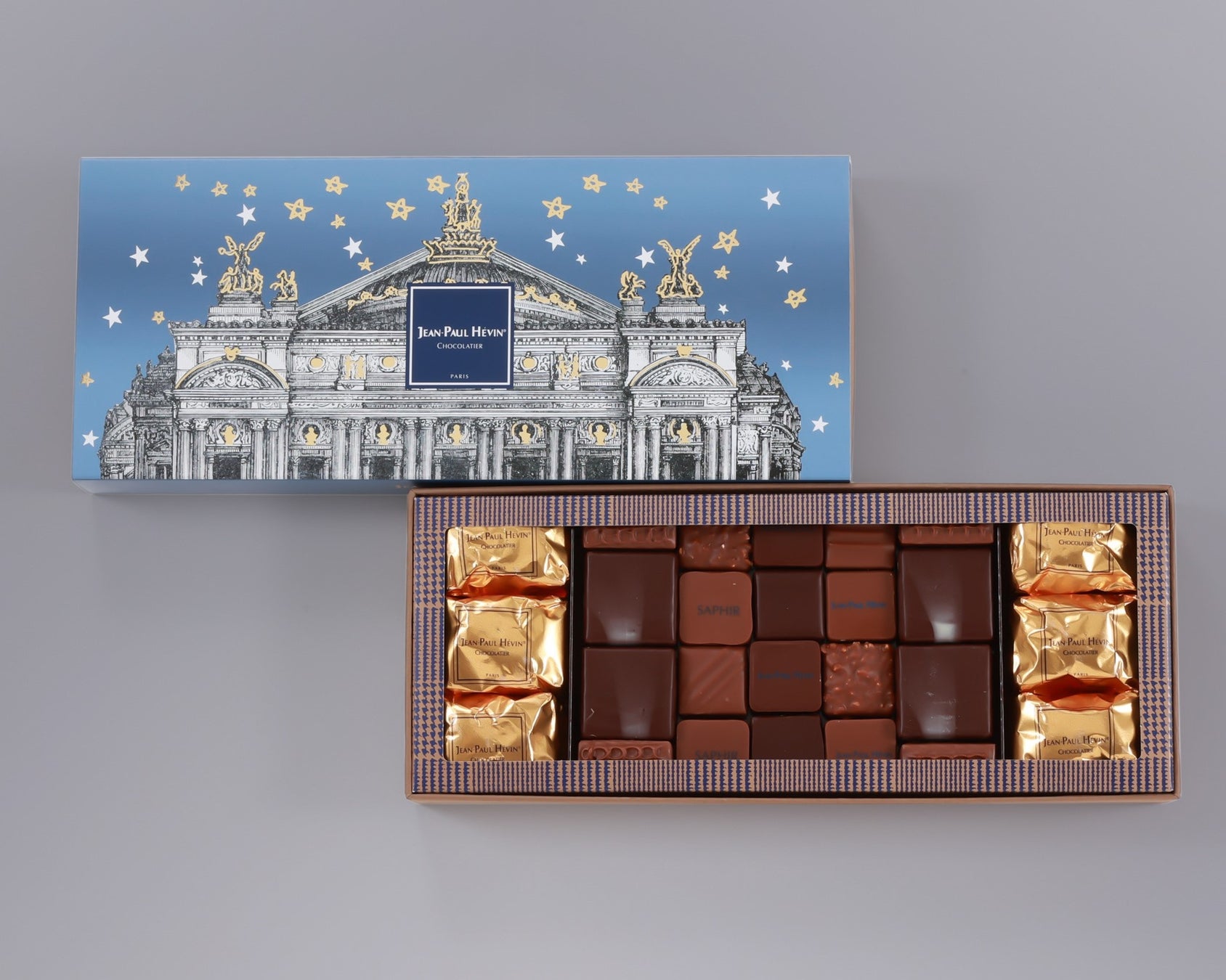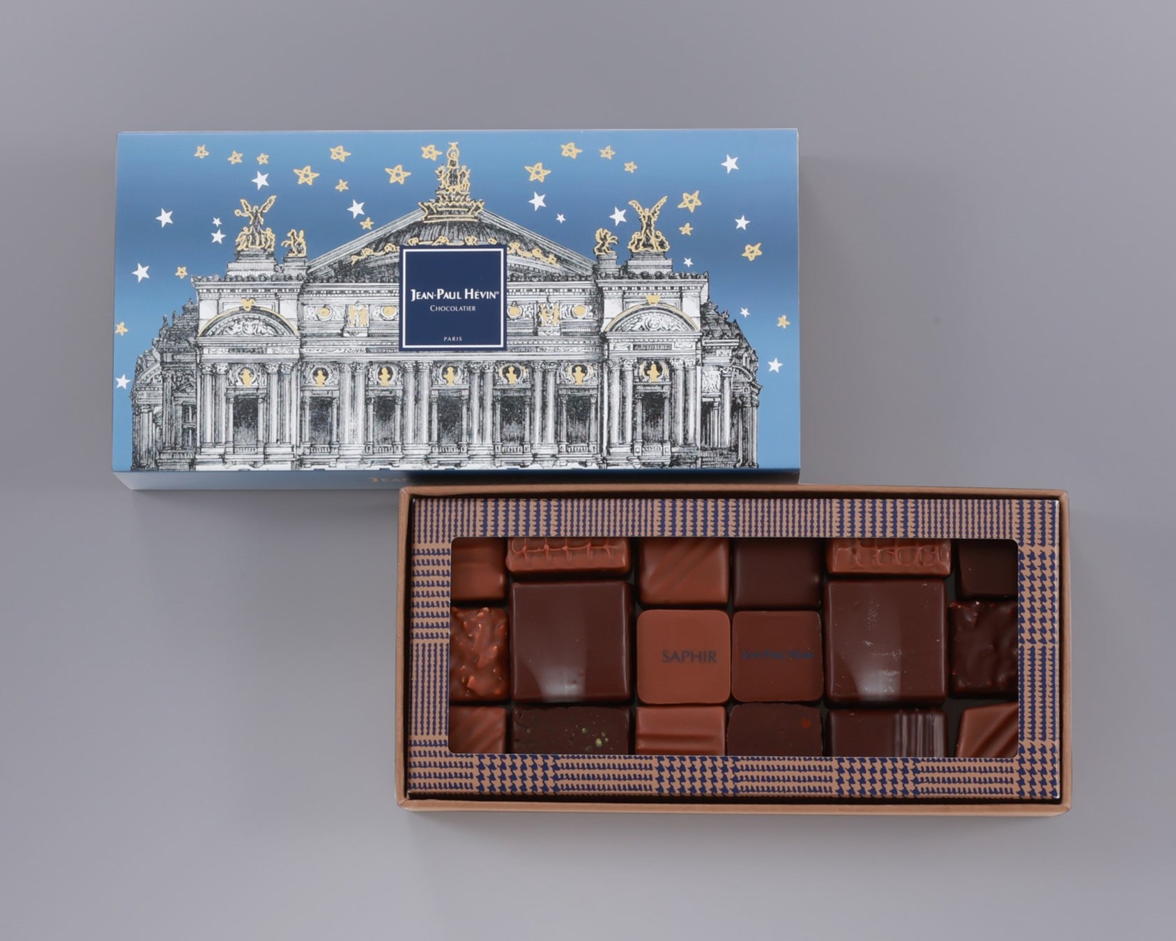 アドヴェントカレンダーと同じオペラ座の夜をイメージした限定スリーブ付き。期間限定のボンボン ショコラ「コロンビィ」を含むショコラ20個詰合せ。40個入りもご用意しています。
