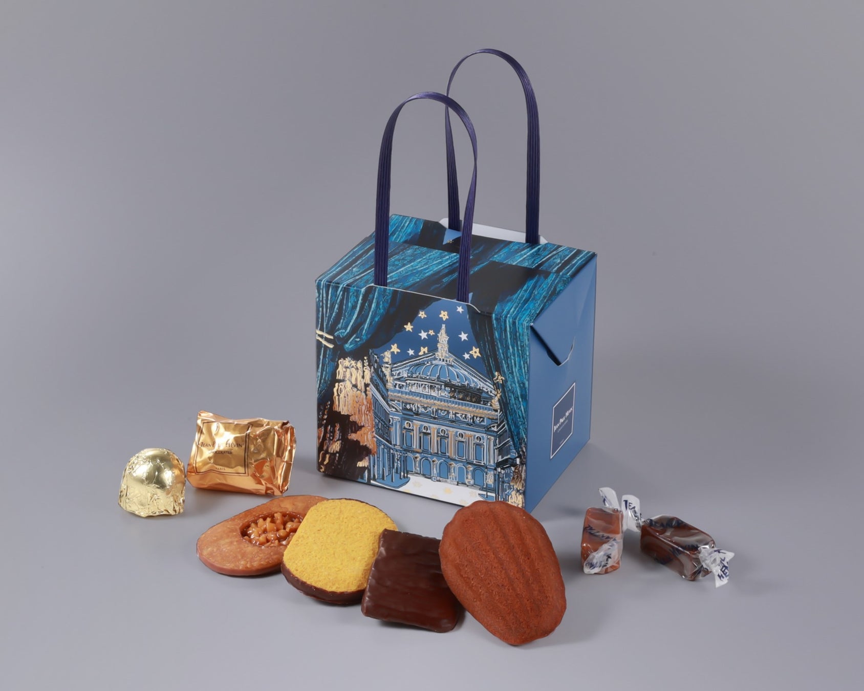 オペラ座をデザインした季節限定のミニボックスに、スリーズオール1個、マロングラッセ1個、焼菓子1個、サブレ2枚、クラッカン1枚、キャラメル2個の詰合せ。