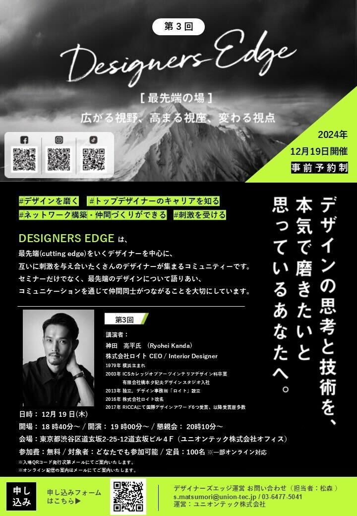 オフィスや商業施設を中心とした空間づくりをワンストップで行うユニオンテック株式会社(本社:東京都渋谷区 代表取締役社長:大川 祐介 以下、ユニオンテック)は、空間設計デザイナーを対象とした成長支援コミュニティ「Designers Edge」の第3回イベントを2024年12月19日(木)に開催いたします。ゲストには株式会社Roito代表の神田亮平氏をお迎えし、デザインにかける情熱とこれまでのキャリアを紐解き、未来を見据えたデザインの可能性について語ります。