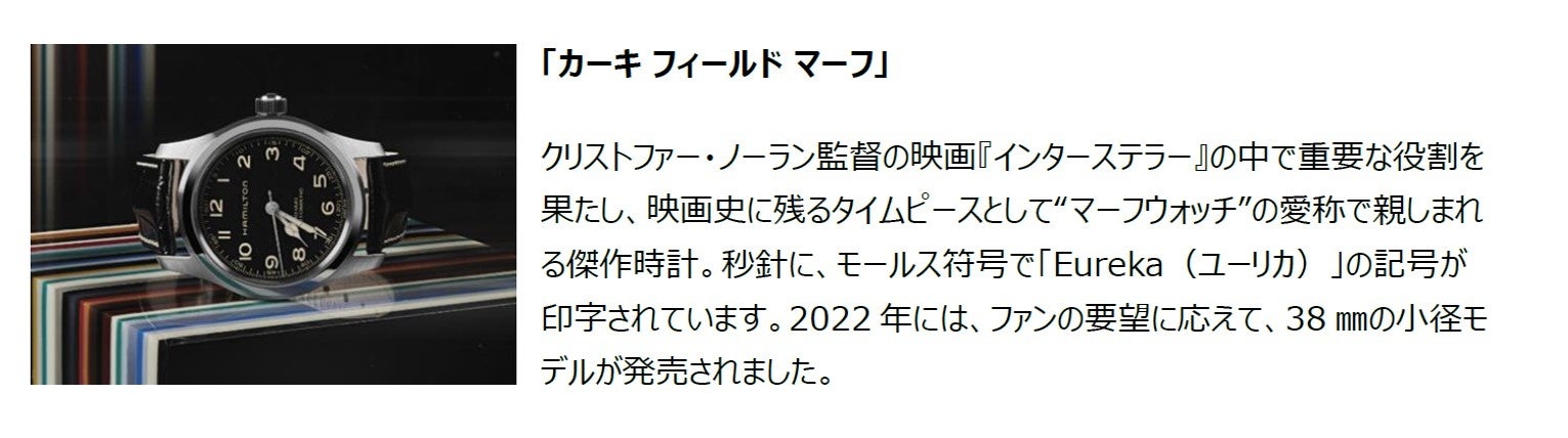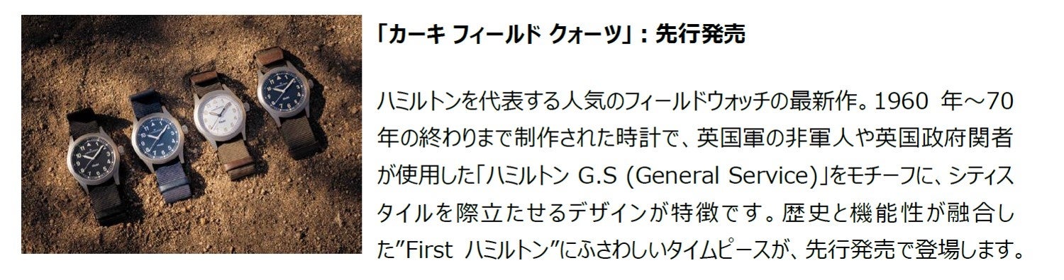 「カーキ フィールド」のオリジンであるミリタリースタイルを踏襲しながらシティでのスタイルにもマッチするデザインを採用した「カーキ フィールド クォーツ」を8月27日(火)の全国発売に先駆けて、8月21日(水)のポップアップストアオープンに合わせて、先行発売。先行で新作を入手できるのは、直営基幹店「ハミルトンブティック 東京 キャットストリート」の他では、阪急うめだ本店のハミルトン ポップアップストアのみとなります。