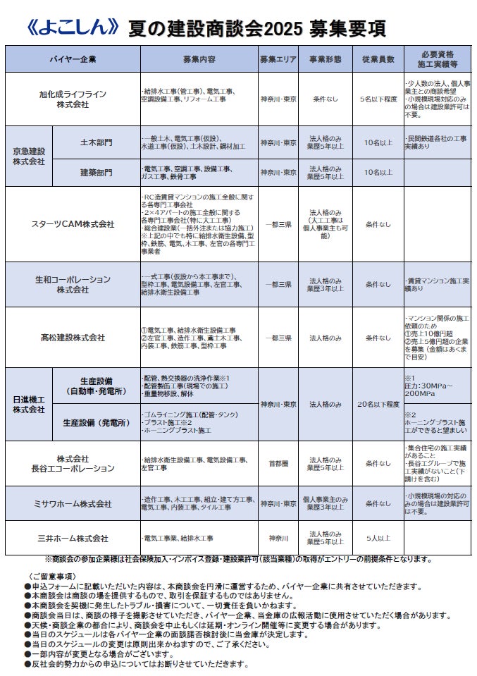 横浜信用金庫(横浜市中区 理事長 春日 隆)は、地域のお客さまの受注機会創出と新たな取引先開拓を支援するため、2025年8月4日(月)に「夏の建設業商談会2025」を開催いたします。