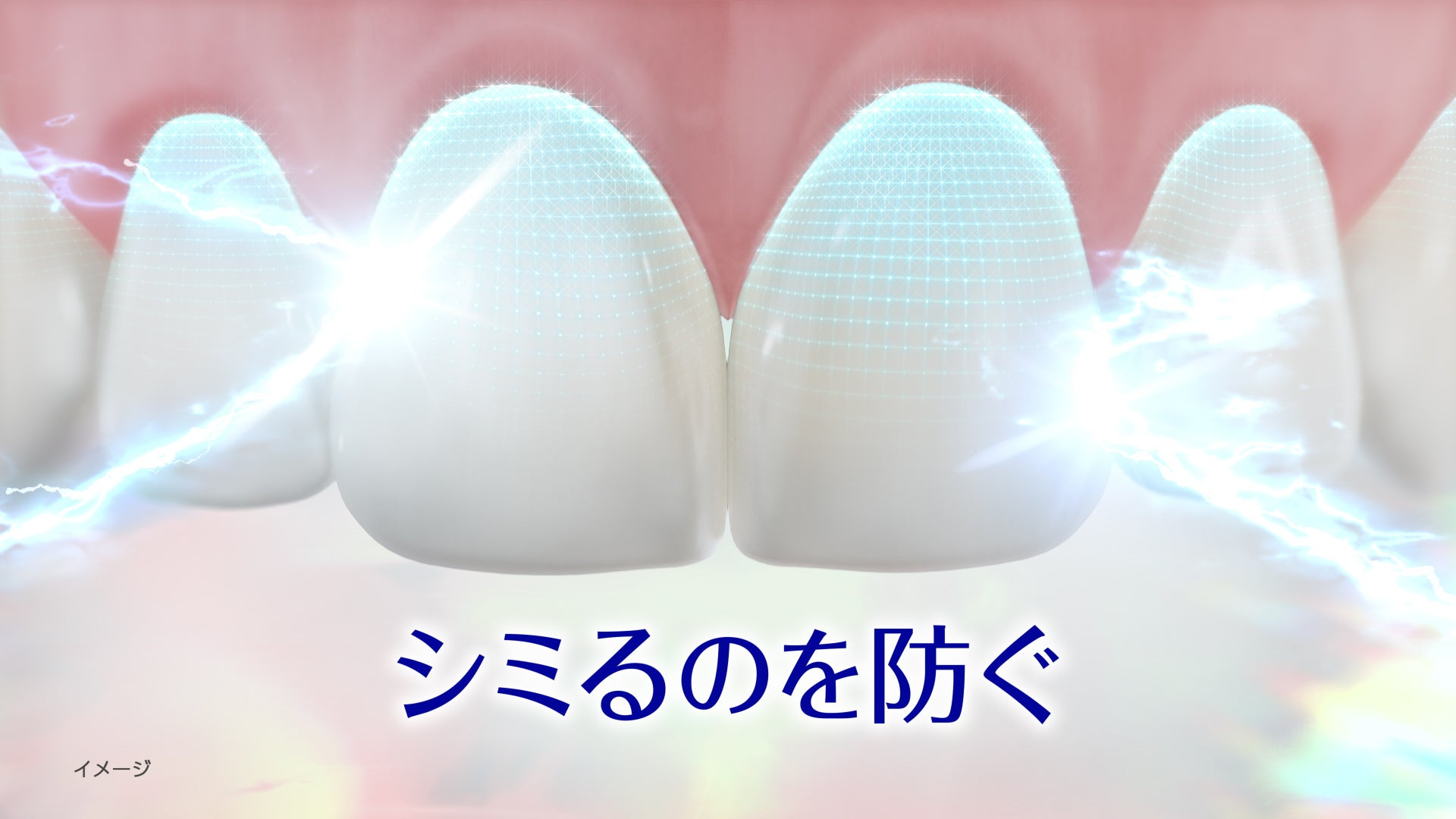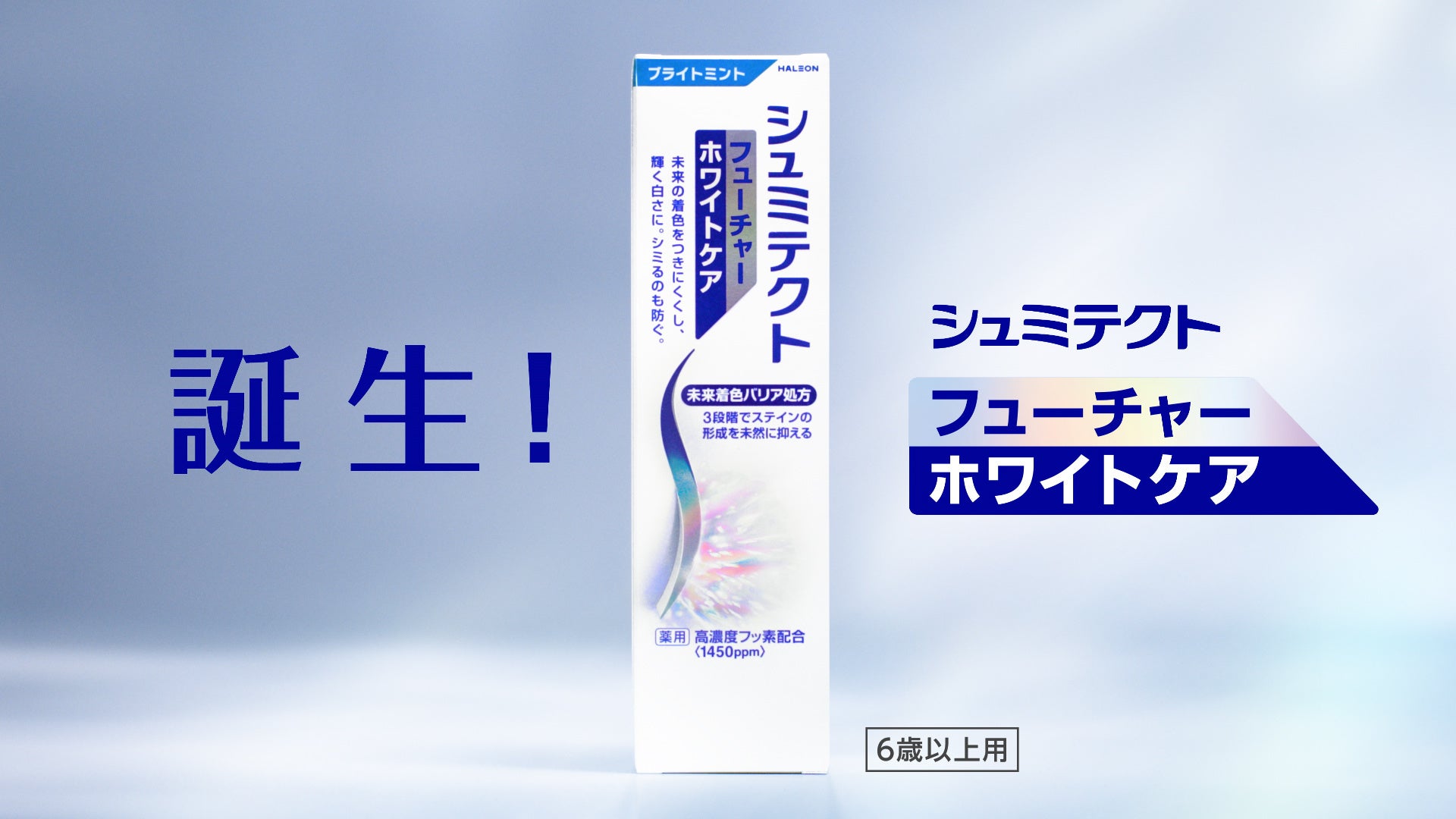 「シュミテクト フューチャーホワイトケア」が、歯がシミるのを防ぐだけでなく、未来の歯の白さにも着目して考えて作られた製品であることを伝えるCMとなっています。