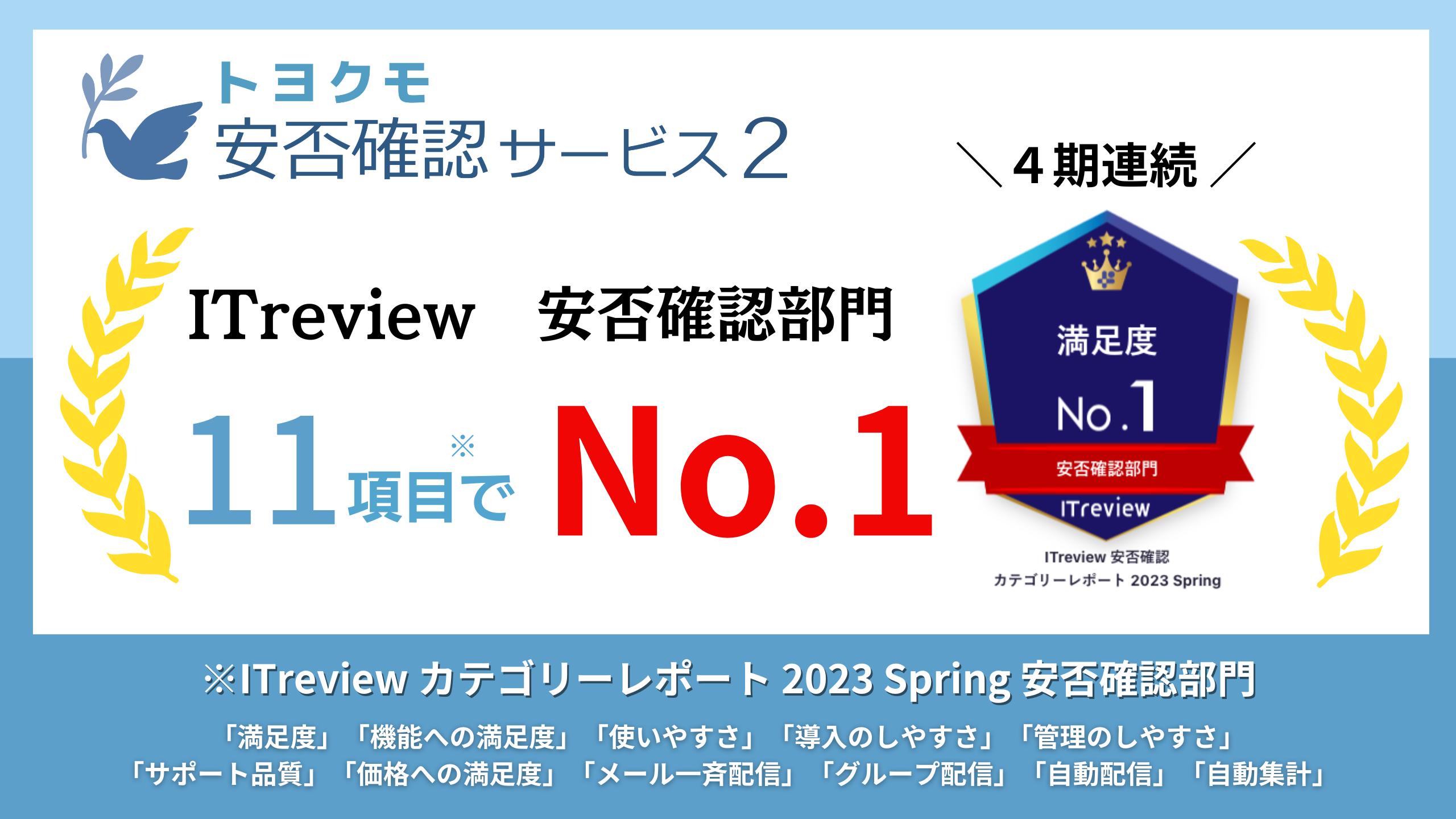トヨクモ、「ITreview カテゴリーレポート 2023 Spring 安否確認部門」4期連続で顧客満足度No.1に選出