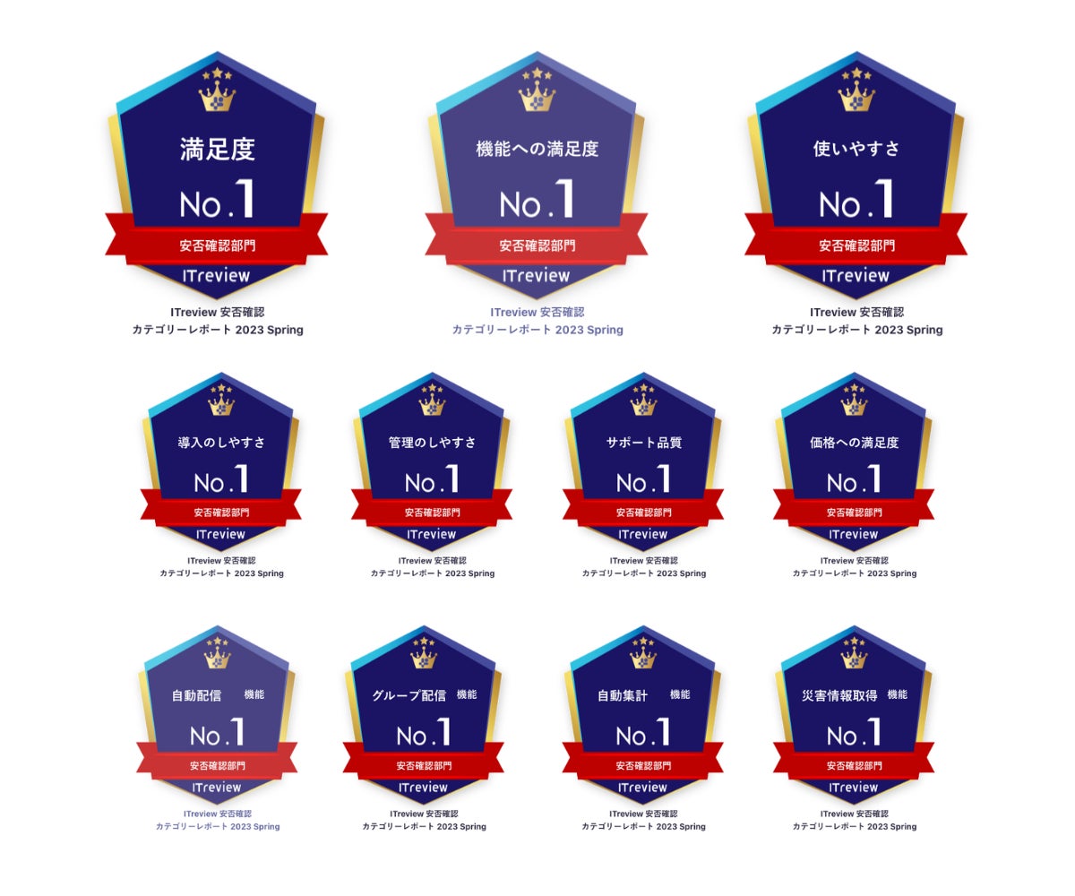 当社「安否確認サービス2」は、安否確認カテゴリの「満足度」「使いやすさ」「管理のしやすさ」などを含めた計11項目でNo.1を獲得いたしました。