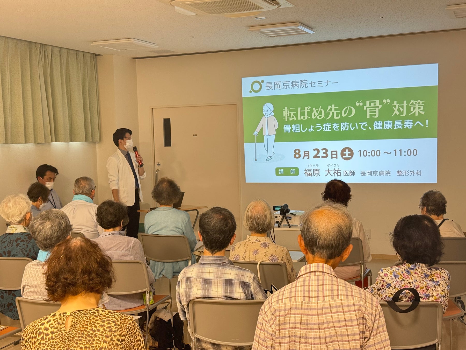 8月に初開催いたしました整形外科セミナーでは、福原医師が「骨粗鬆症の予防」をテーマにお話をいたしました。早期に満席となり、25名の方にご参加いただきました。セミナー終了後も熱心に質問をされている参加者もおり、関心の高さが伺えました。