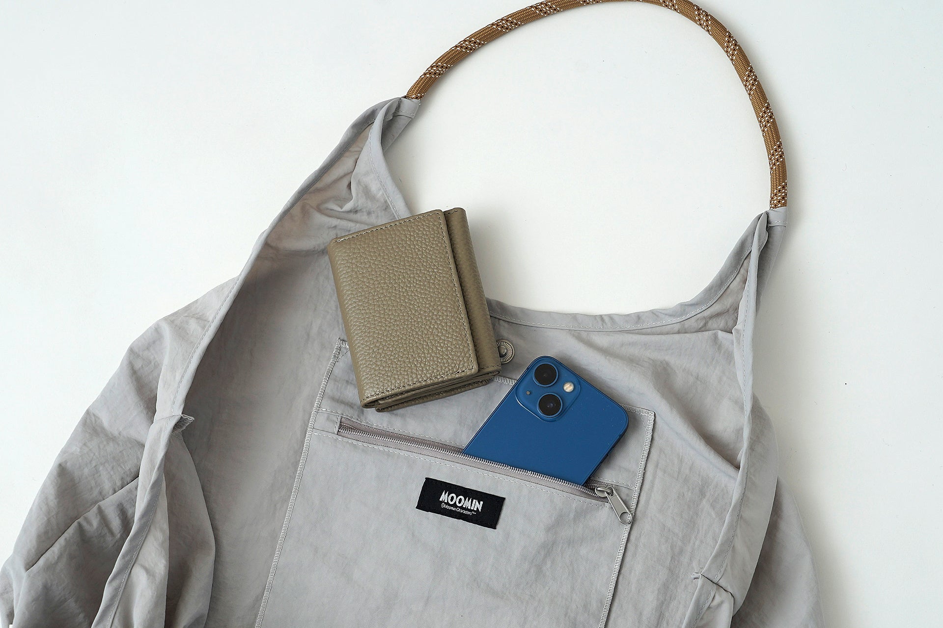 ニョロニョロが刻まれたホックが上部に付いていて、内部には、お財布や小銭を入れられるファスナー付きのポケットを搭載。