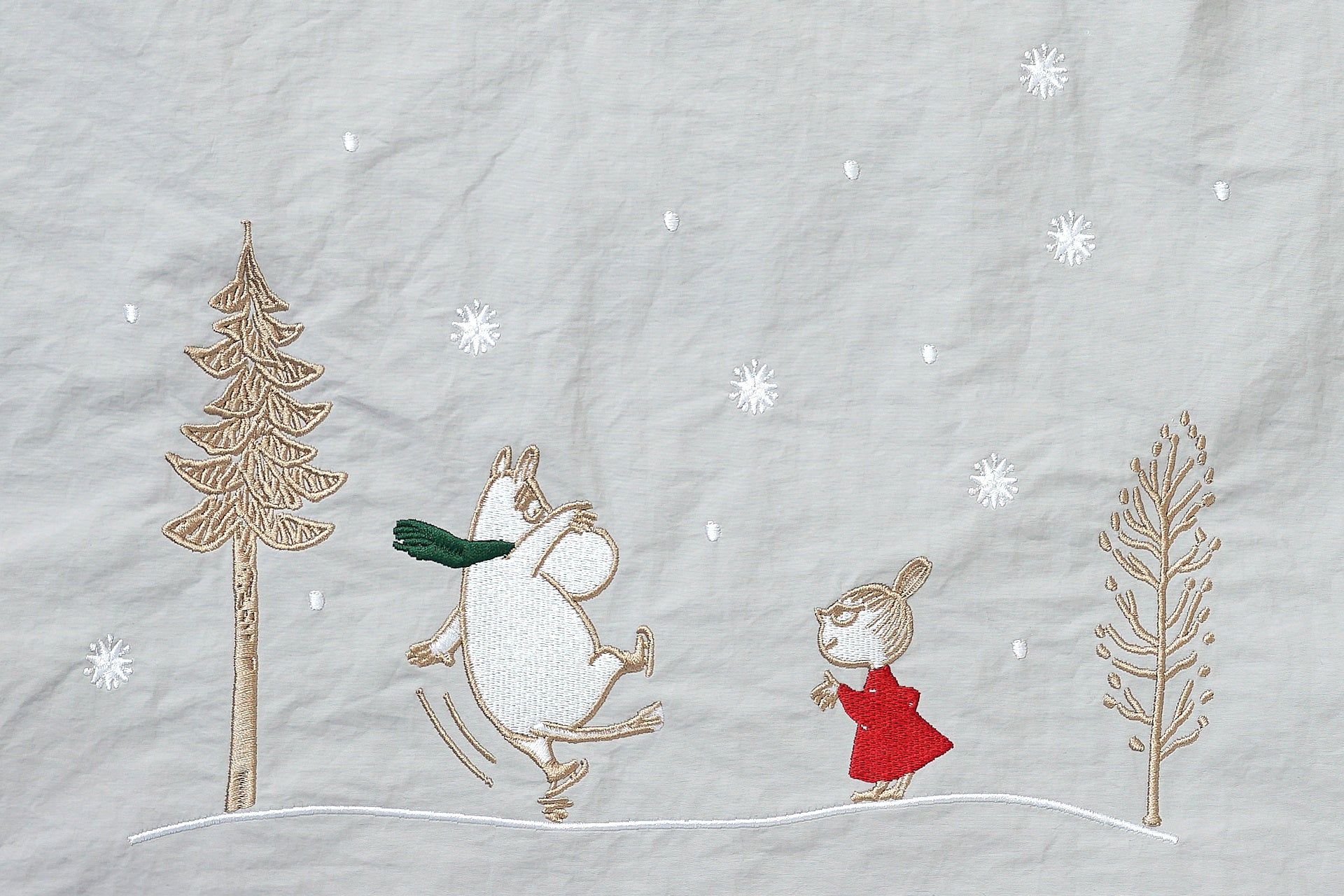 【ムーミン】心躍る冬の新作。雪景色をまとうアートのような刺繍バッグが登場。ムーミンとリトルミイが雪の日を楽しむ、心温まるワンシーンを表現。冬の装いを格上げする特別な軽いバッグでお出かけしませんか?