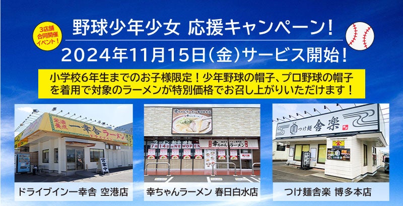 集まれ!野球少年少女たち!【3店舗合同開催イベント!】2024年11月15日(金)よりサービス開始!ラーメン、つけ麺が特別価格でお召し上がりいただけます!