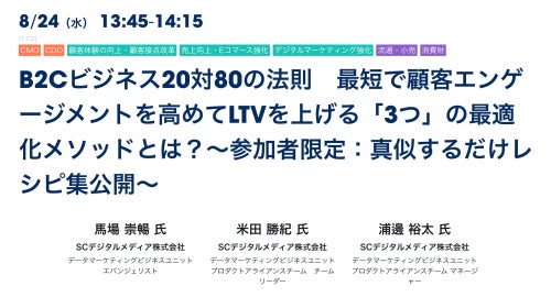 住友商事株式会社の100%子会社、SCデジタルメディア株式会社(東京都渋谷区、代表取締役社長:野﨑健、以下 SCデジタルメディア)は、株式会社セールスフォース・ジャパン(本社:東京都千代田区、代表取締役会長兼社長:小出 伸一、以下 Salesforce)が開催する、マーケティング・EC向けに最新のデジタルテクノロジーと海外の先進事例をご紹介するオンラインイベント「Salesforce Connections to You 2022」のウェビナーに登壇。8月24日(水)13:45より「B2Cビジネス20対80の法則・最短で顧客エンゲージメントを高めてLTVを上げる「3つ」の最適化メソッドとは?」を開催します。