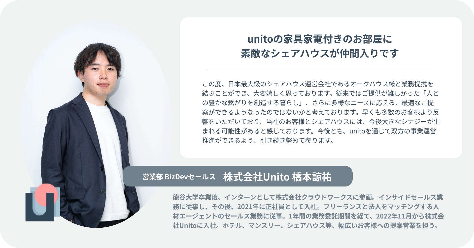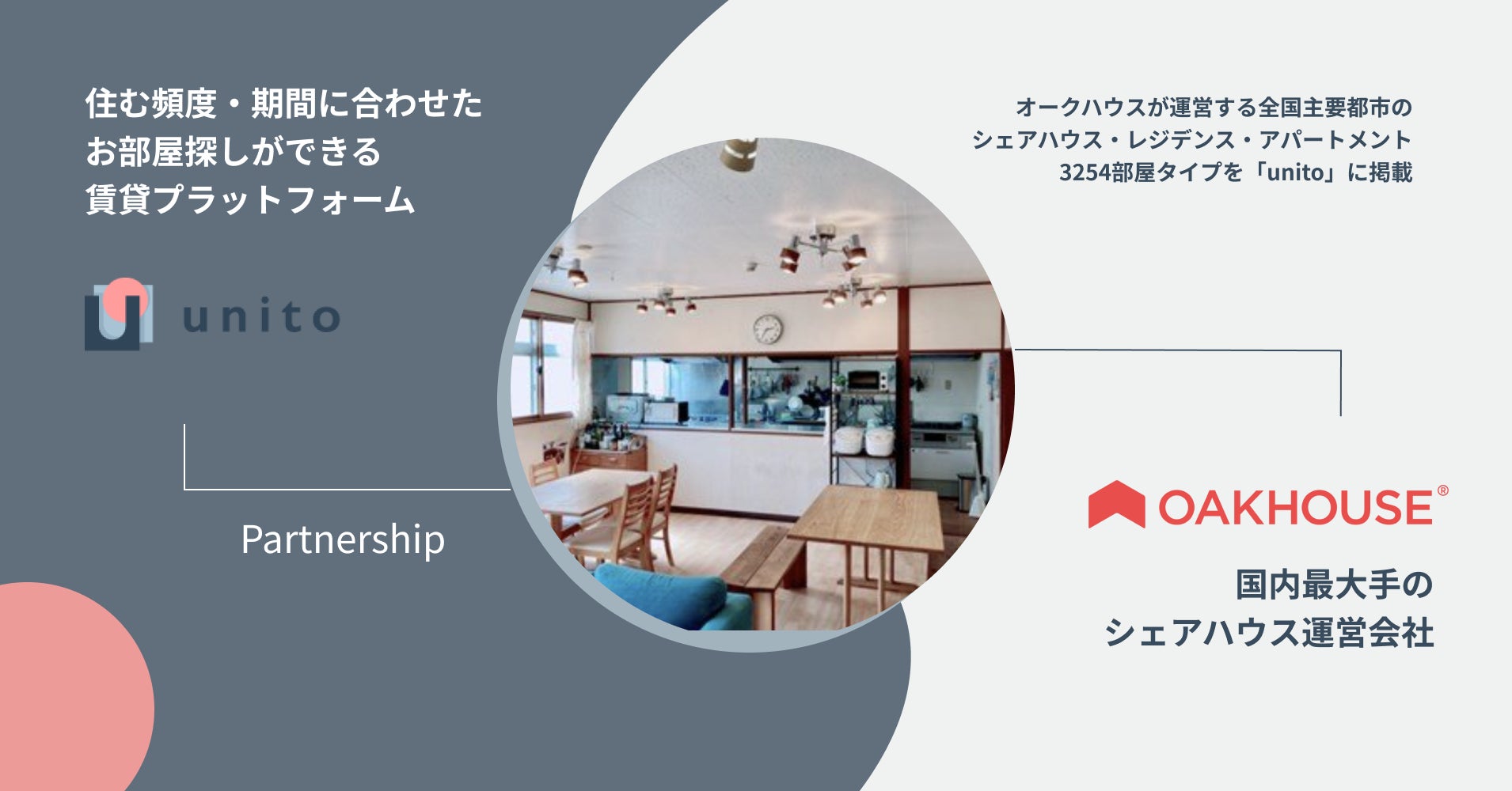 「unito」、日本最大級シェアハウス運営会社のオークハウスと業務提携