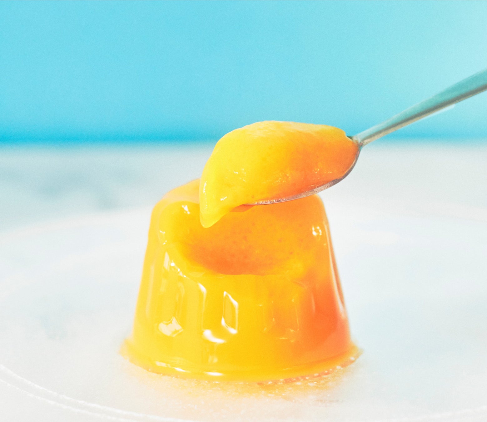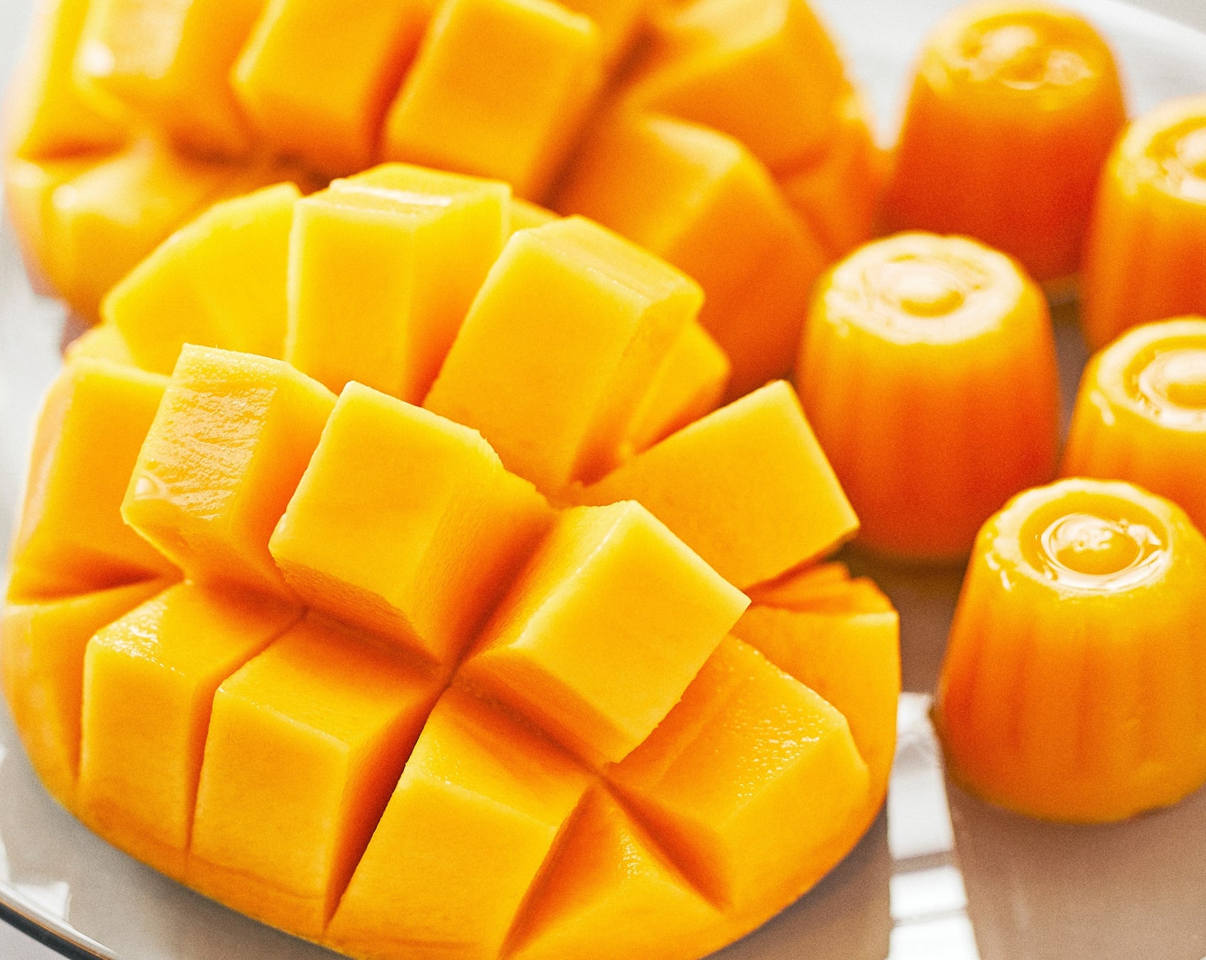 ひとくちマンゴーゼリーは、アルフォンソマンゴー100%のピューレを贅沢に使用し、まるで果実を丸かじりしたかのようなジューシーさを表現しました。