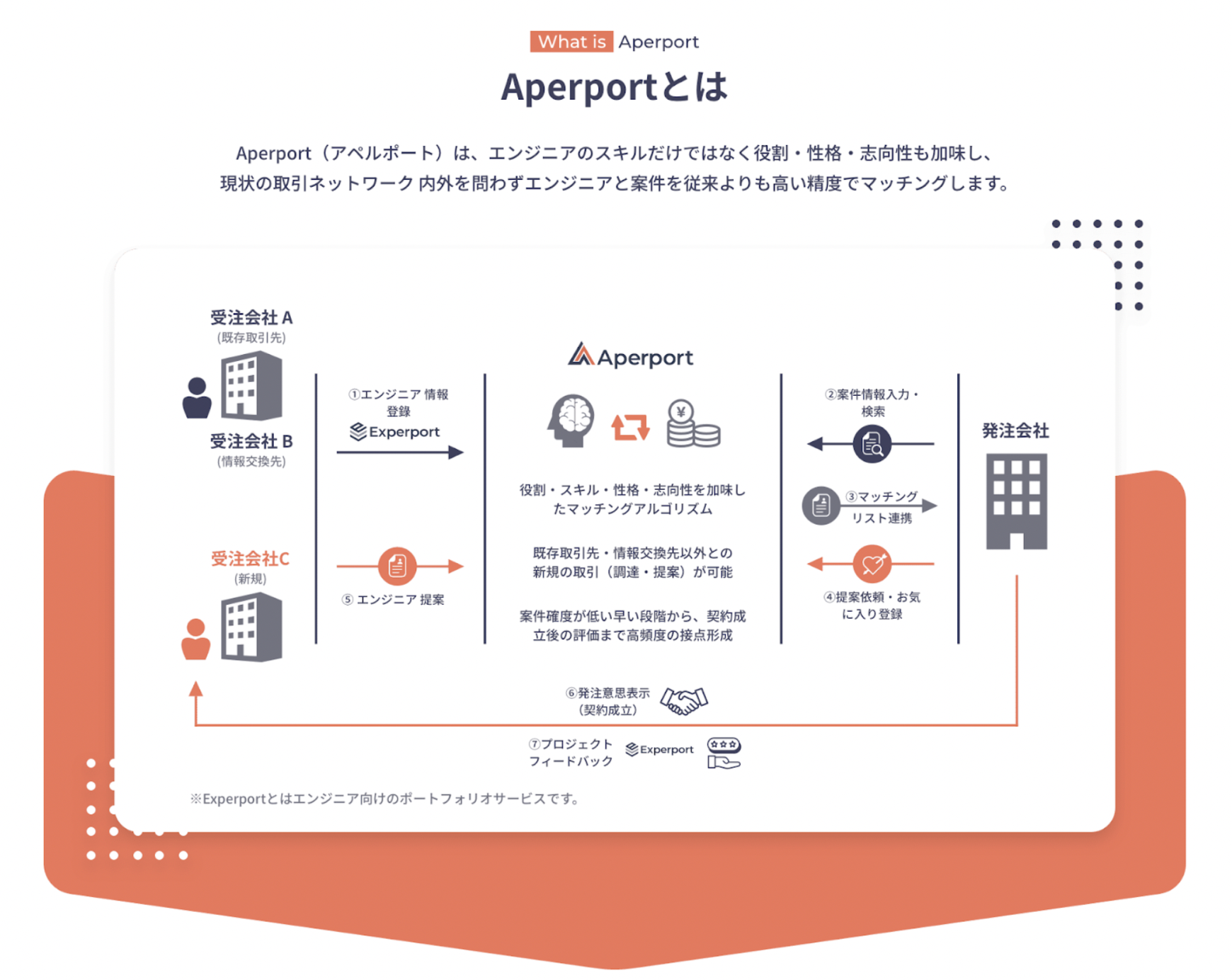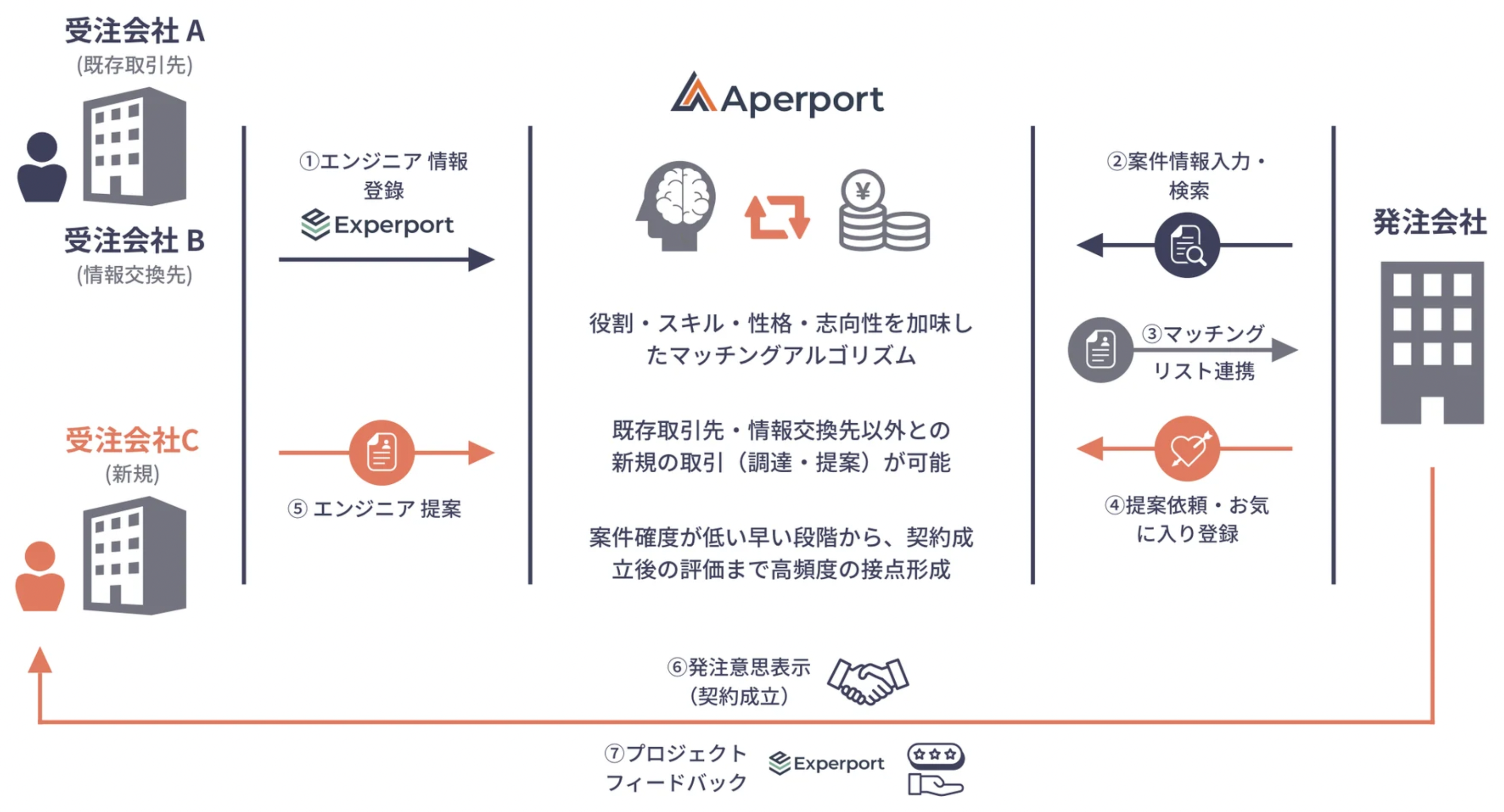 「Aperport」はシステム開発を行うSIerやSES企業などの情報システム開発会社(以下、発注会社)が、取引関係にあるパートナー会社(以下、受注会社)からエンジニアの調達を行う際に、よりスピーディーに最適な人材とマッチングできるサービスです。