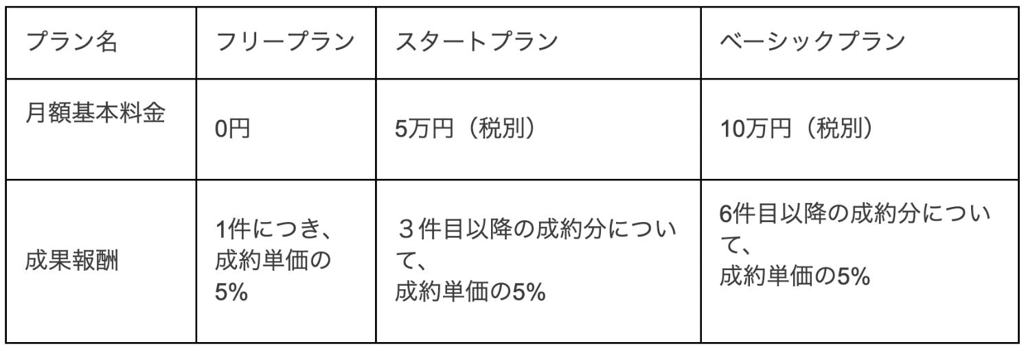 フリープラン、スタートプラン、ベーシックプランがあり、いずれも基本料金と成果報酬の組み合わせた料金体系となっております。