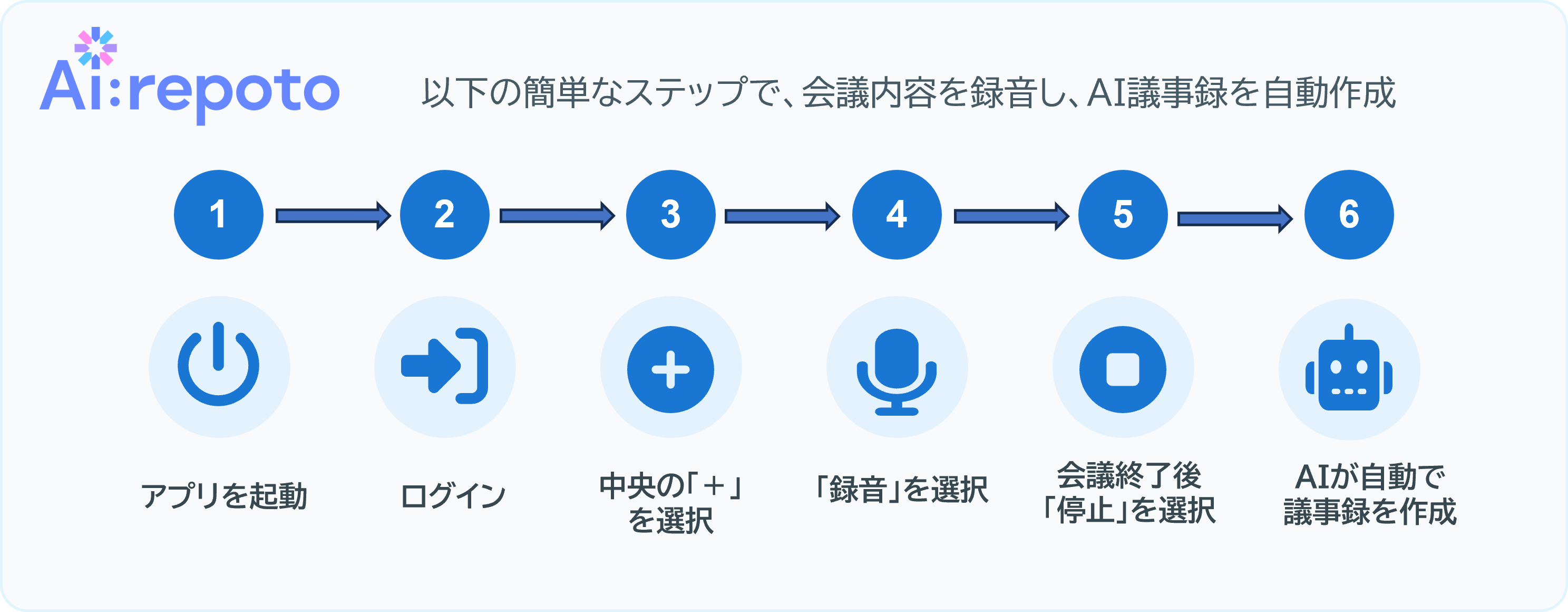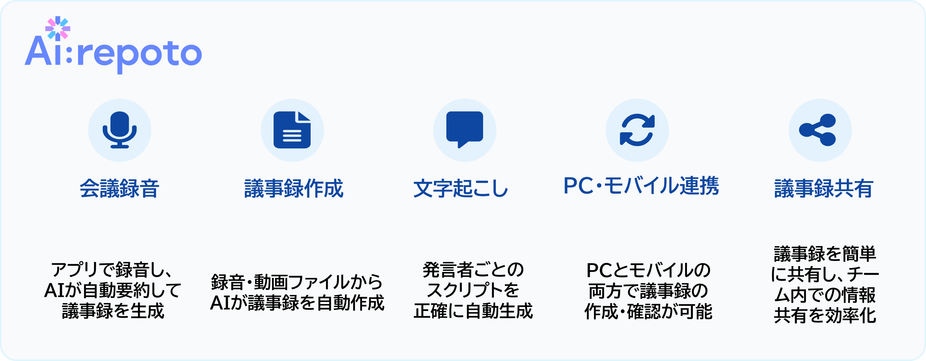 Ai:repoto(エイアイレポト)は、どんなシーンでも会議の記録を活用できるようにし、会議の可視化を通じてチームの生産性とコミュニケーションの質を高めることを目的としています。