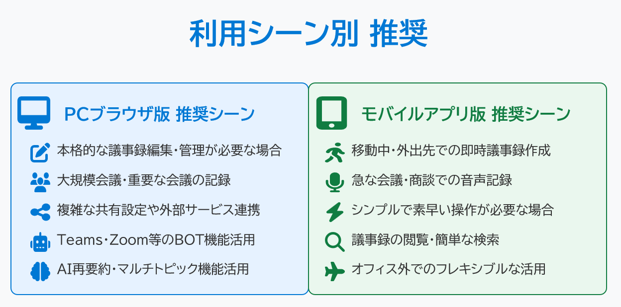 モバイルアプリ版 推奨シーン:外出先や移動中の即時議事録作成・急な商談記録・簡単な確認や共有