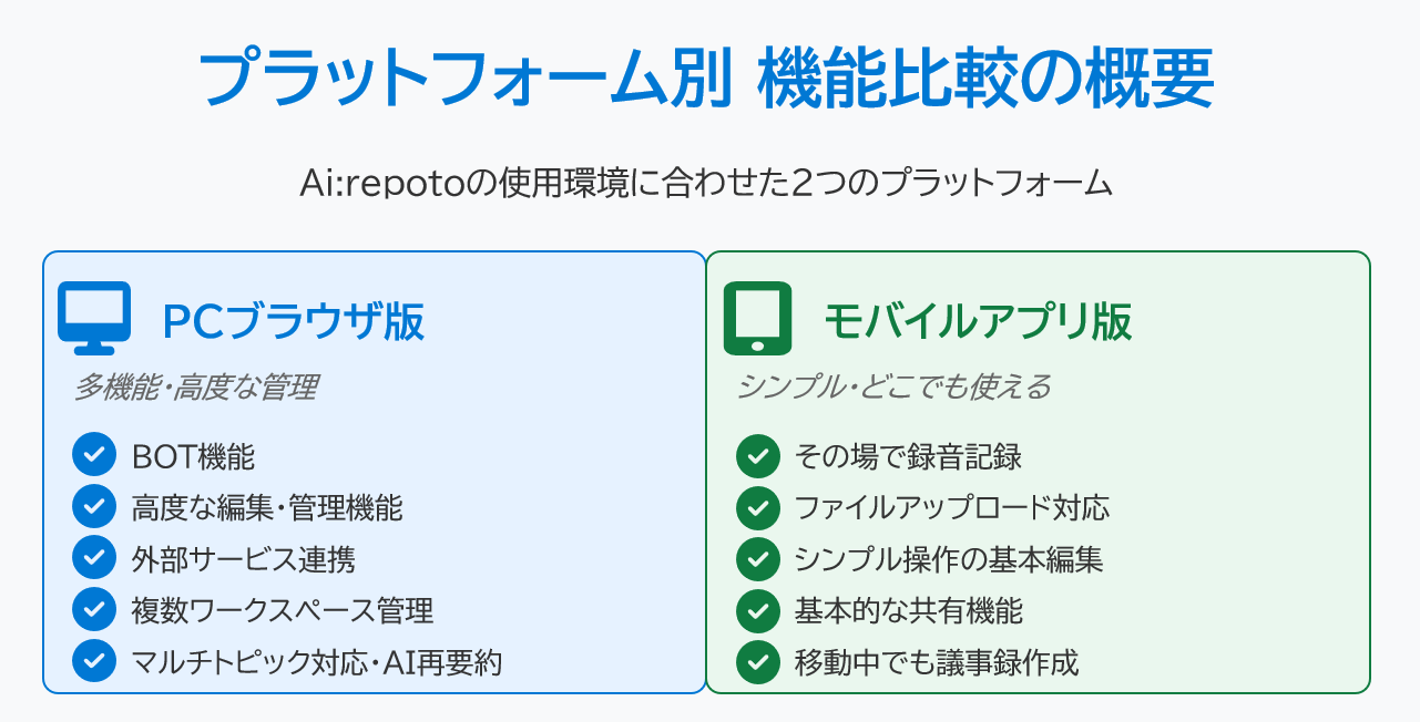 今回のモバイルアプリ版リリースにより、Ai:repoto(エイアイレポト)は利用シーンに合わせて2つのプラットフォームを提供。
