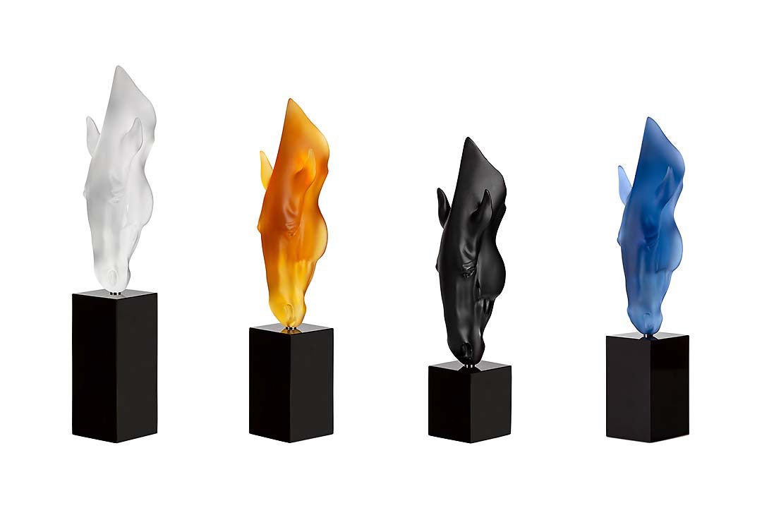 また、高さ約25cmの限定エディションには、ラリックがアーティストと協力し特別に開発したスチール性の鋳型が使用されています。1000℃以上に加熱された素材を型に注入するためには、長年の経験と高度に訓練された技術を要します。熟練の職⼈による数々のプロセスを経て、ようやく⾺頭に命が宿ります。