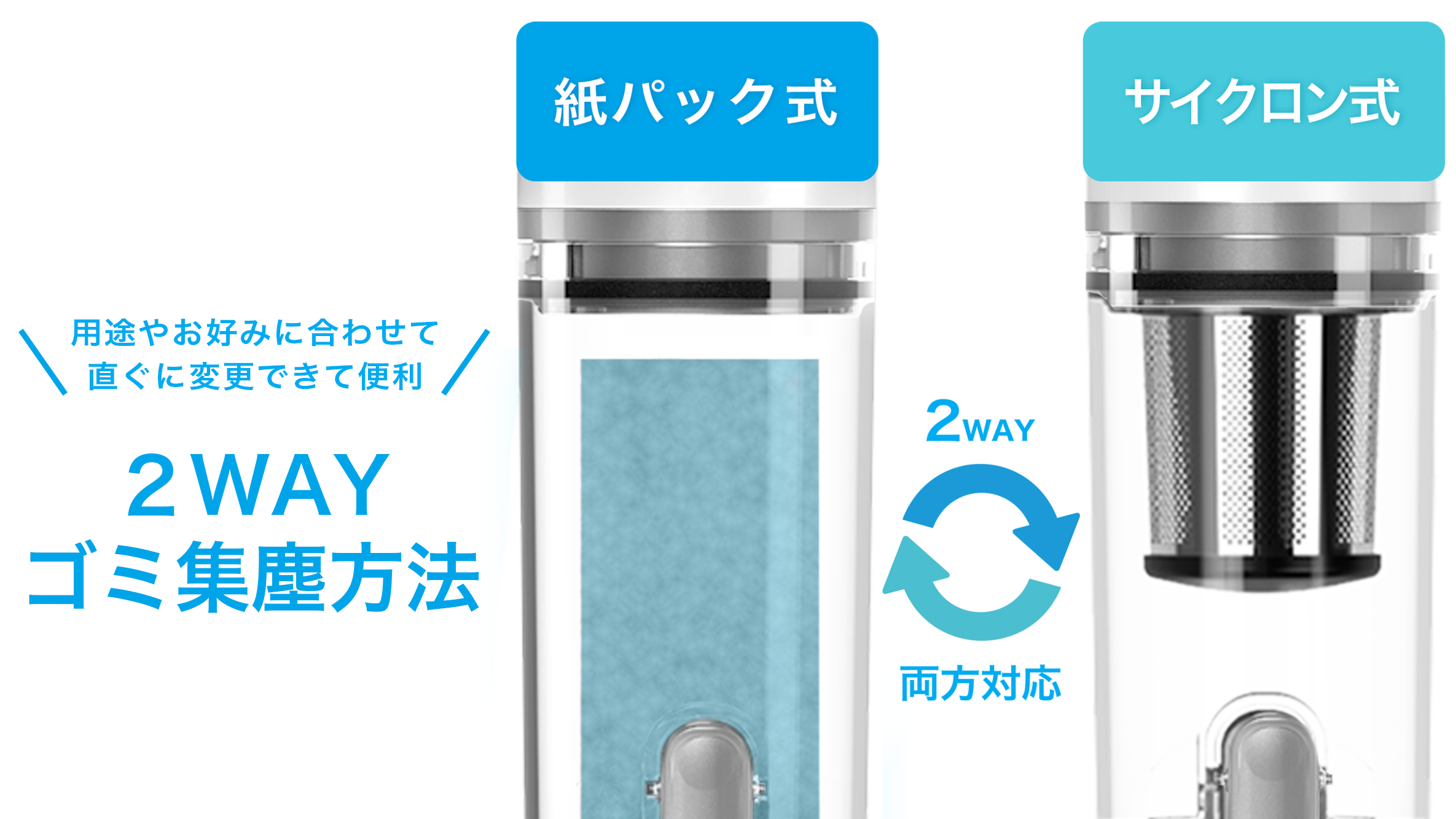 サイクロン / 紙パックのどちらの捨て方も選べる独自構造になっています。切り替えが簡単なので、手を汚さずに簡単に捨てられる方が良い方はサイクロン式を、塵・埃の飛び散りを気にされる方は紙パック式を使用といったように状況に合わせて使い分けができます。