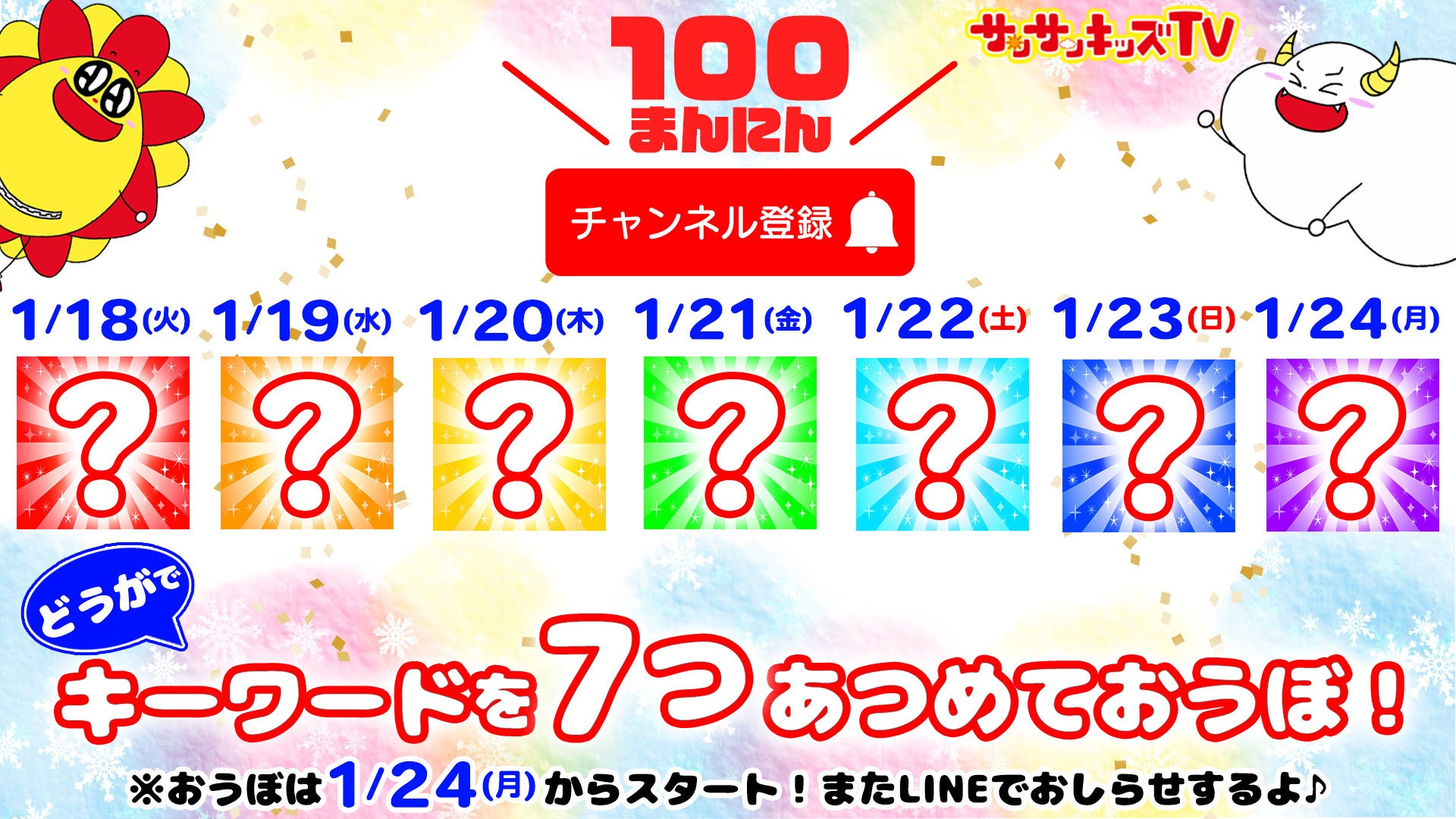 本日1月18日(火)から1月24日(月)までの7日間、サンサンキッズTVのYouTubeチャンネル内で配信される動画に隠されたキーワードを集めて応募!