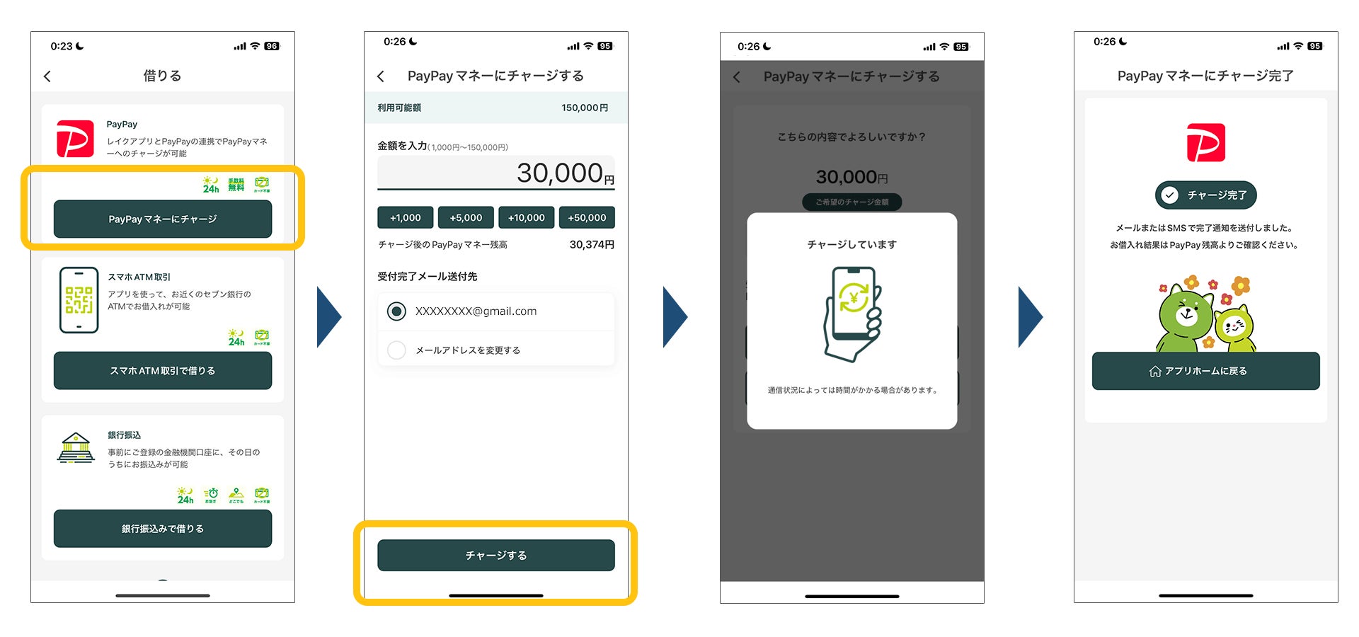 レイク公式スマートフォンアプリ「レイクアプリ」で初回のご利用登録を行っていただけましたら、簡単・便利にスマホ一つでレイクのローン返済を行うことができるようになります。また、PayPayマネーへのチャージも可能です。