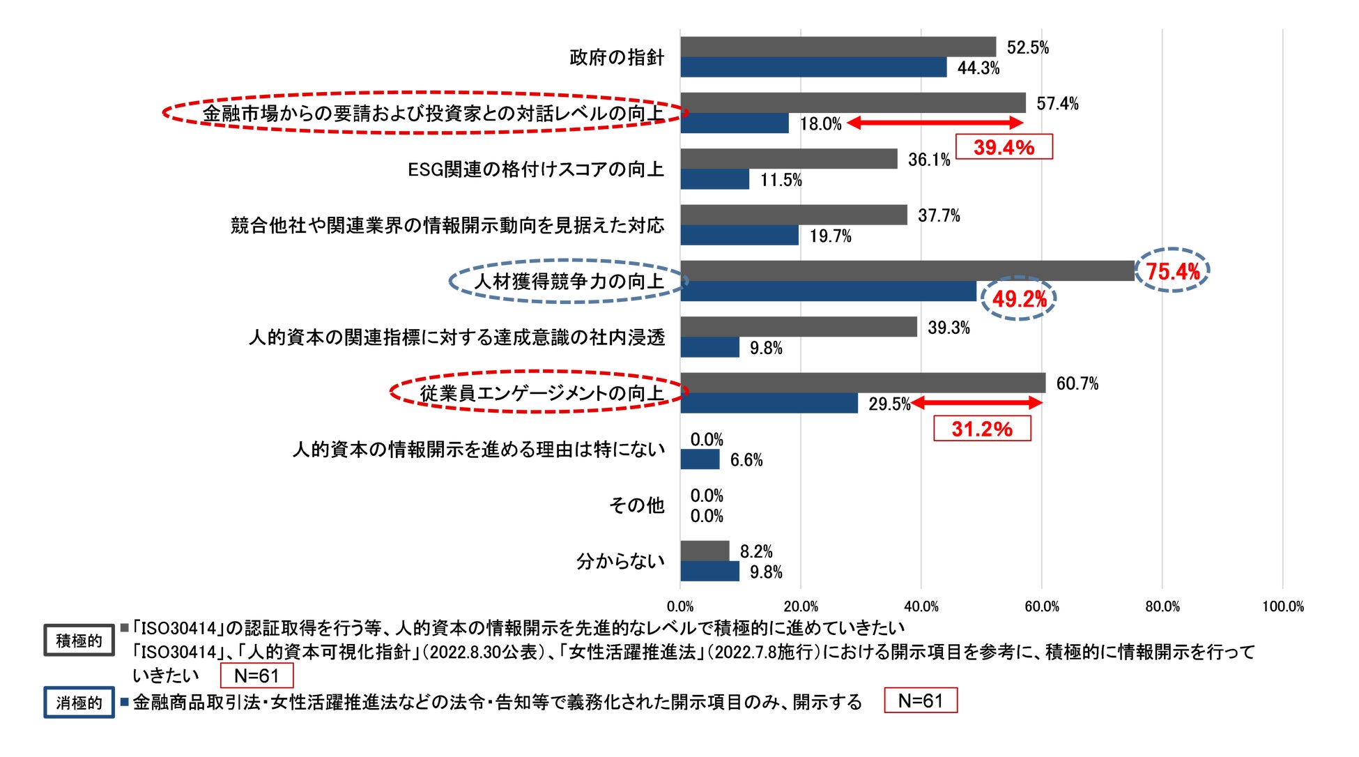 情報開示に積極的な企業では、「金融市場からの要請および投資家との対話レベルの向上」「従業員エンゲージメントの向上」を開示理由・期待効果として挙げている比率が、消極的な企業と比し30ポイント以上高いことが示されました。
