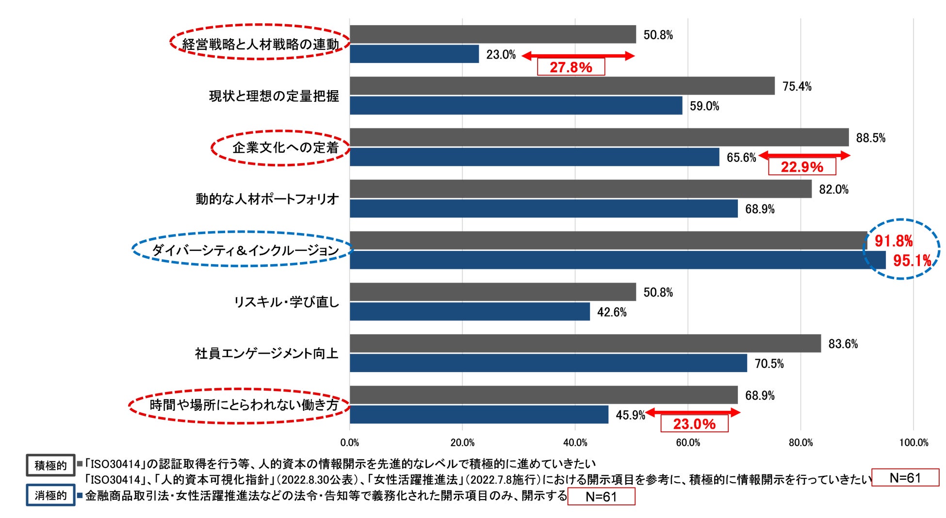 情報開示に積極的な企業では、経営と社員双方に深い関与や意識転換が求められる「経営戦略と人材戦略の連動」「企業文化への定着」「時間や場所にとらわれない働き方」に対する取組が、消極的な企業と比較し、20ポイント以上高いことが示されました。