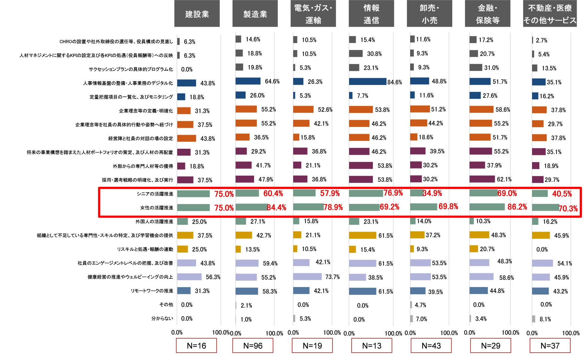 人的資本経営を推進するための取組を業種別に集計した結果、全ての業種において、「女性の活躍推進」と「シニアの活躍推進」が高い結果ことが示されました。